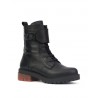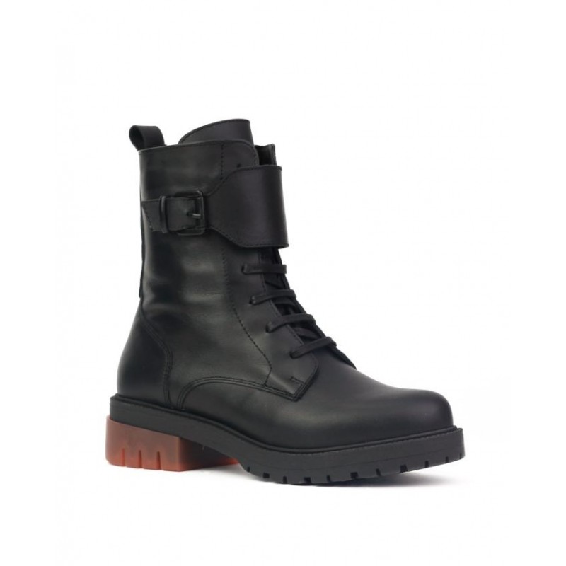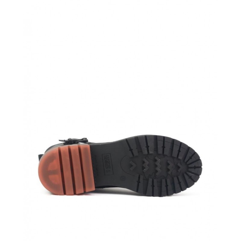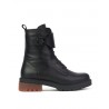 Botines con cordones de mujer negro Coronel Tapiocca. Fabricados en vacuno noble en color negro. Cierre cordones para ajuste al pie mas una hebilla para ajustar a caña. Cremallera interior para facilitar la puesta y retirada del botín del pie. Tirador trasero. Altura de caña 17 cm. Forro textil. Plantilla extraible eva en tejido. Altura de tacón 4.5cm y 2 cm de plataforma. El tacón doble es rojo transparente. Fabricado en España en instalaciones propias