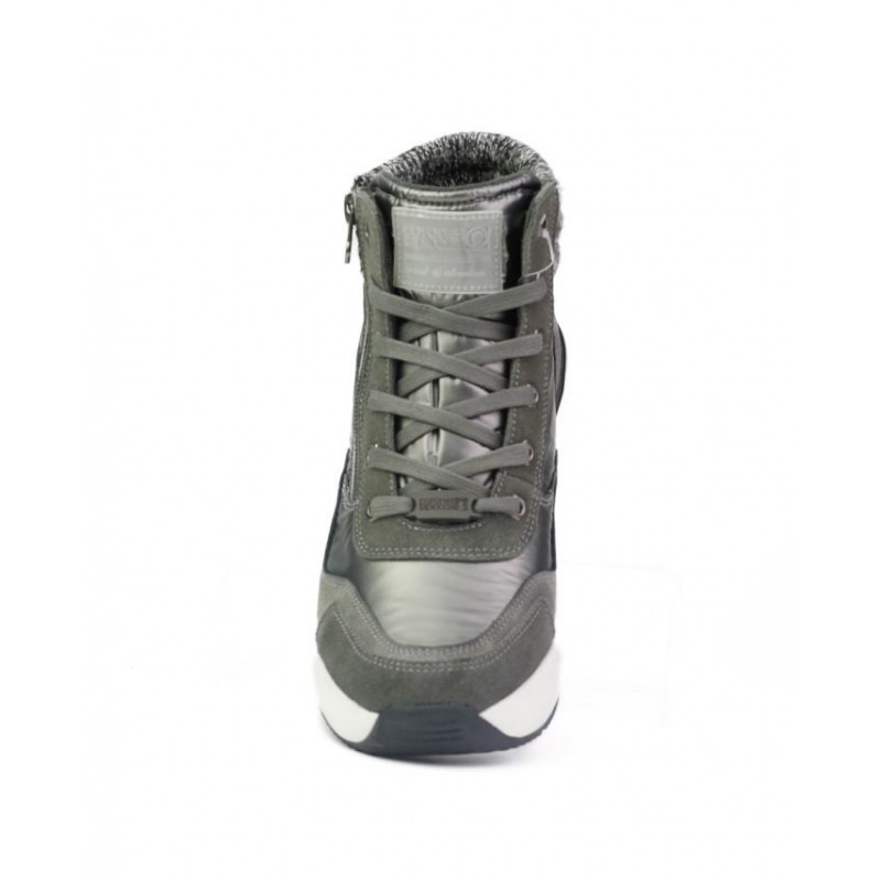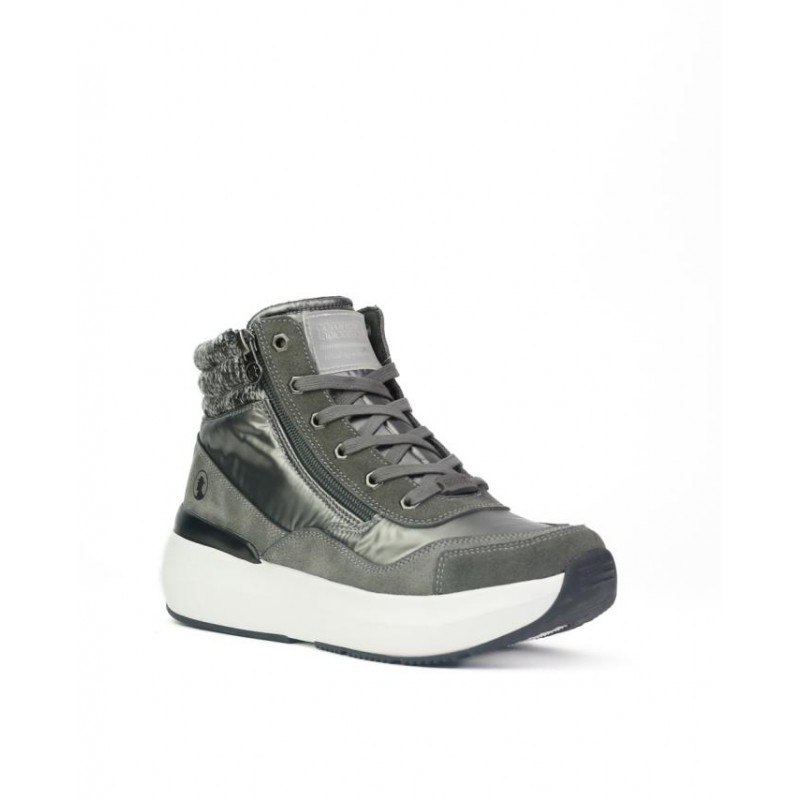 Botines con cordones Coronel Tapiocca Mujer en Gris. Fabricado en serraje combinado con textiles y otros materiales. Cierre cordones para ajuste al pie y una cremallera exterior para facilitar la puesta y retirada del pie. Cuello de lana. Altura de caña 9.5 cm. Plantilla extraible muy comoda. Altura de suela 4 cm.