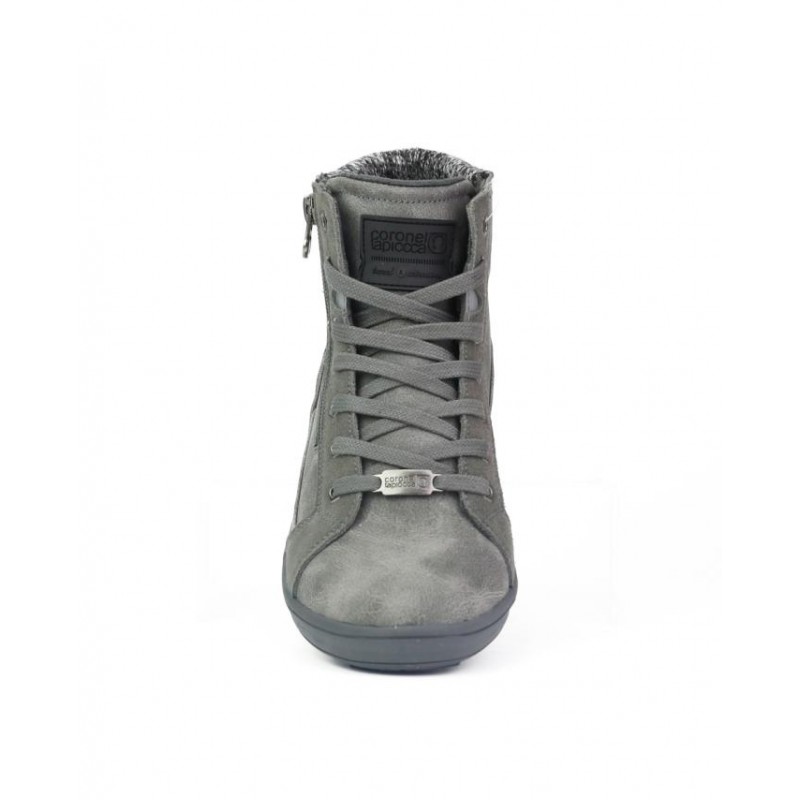 Botines con cordones Coronel Tapiocca Mujer Gris T323-9. Fabricado en serraje combinado con otros materiales. Cuello de lana gris. Cierre cordones con cremallera exterior para facilitar la puesta y retirada del producto. Forro en tejido. Plantilla extraible en tejido muy comodas. Altura de suela 3 cm. Composición: Empeine: Piel/Fibra sintética. Forro y plantilla: Textil. Suela: Fibra sintética.