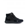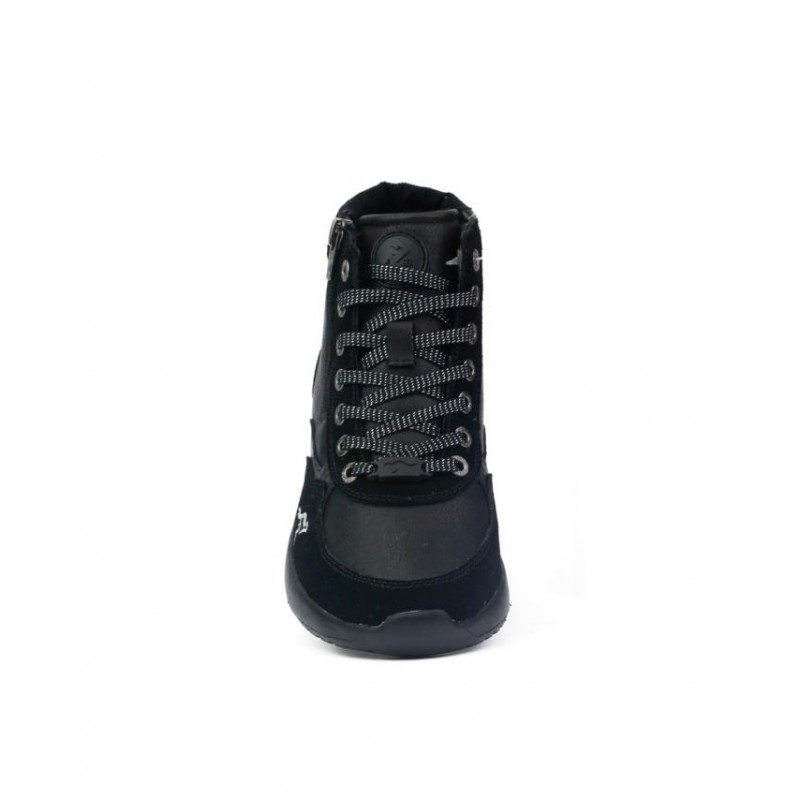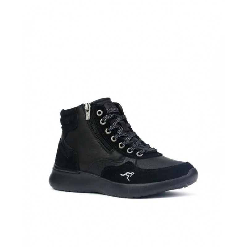 Botines con cordones KangaROOS Mujer en negro. Fabricado en serraje negro combinado con otros materiales. Forro interior en tejido. Plantilla interior tejido extraible muy comodas. Altura de caña 9 cm. Cierre cordones para ajuste al pie y cremalla exterior para facilitar la puesta y retirada. Suela phylon ligero de 3cm de altura.