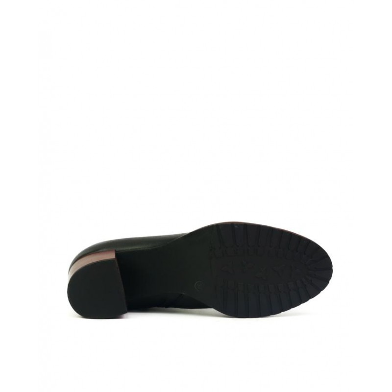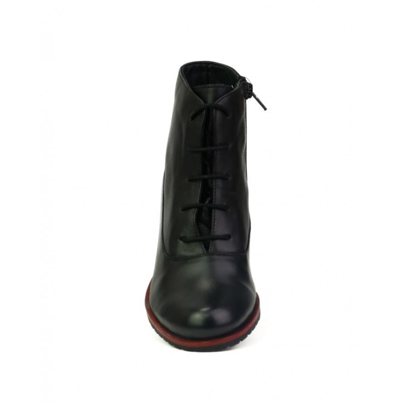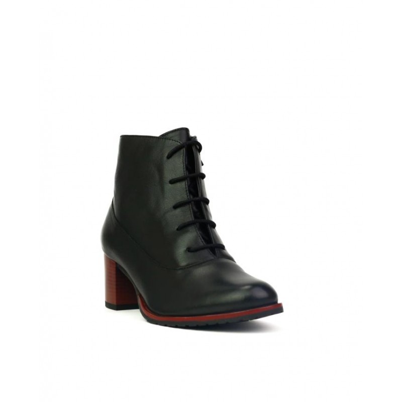 Botin piel vacuno de primera calidad en color negro. Forro textil combinado con piel. Cierre cordones y una cremallera interior para facilitar puesta y retirada del calzado. Altura de tacón 5.5 cm en color rojo a contraste. Composición: Empeine: Piel. Forro: Textil. Plantilla: Piel. Suela: Fibra sintética. Componente principal: Piel