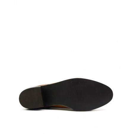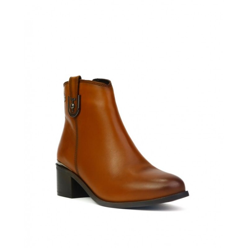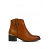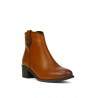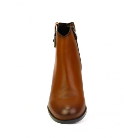 Botines en piel cuero vacuno. Forro en piel combinado con textil. Detalle metalico en suela y adorno en caña en dorado. Cremallera interior. Altura de 4.5 cm