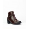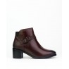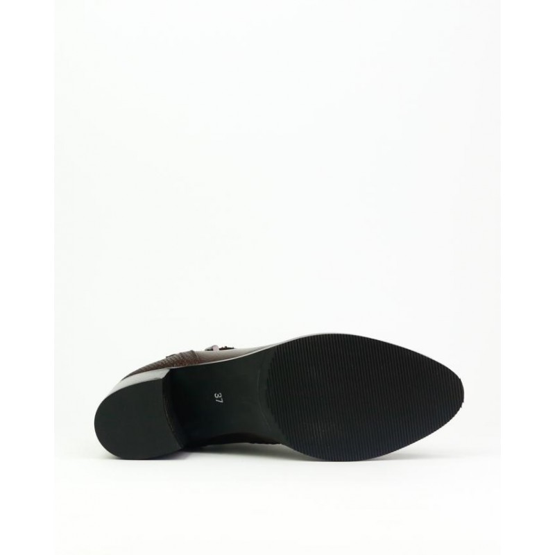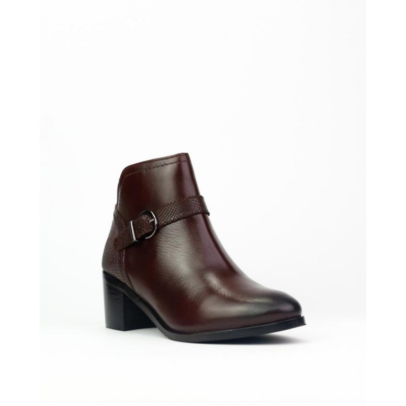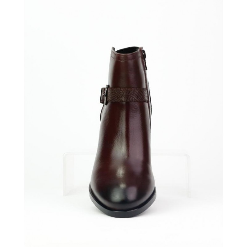 Botin marca Caramelo fabricado en piel vacuno de color burdeos de primera calidad. Forro piel combianado con textil para mejorar la sensacion de confort. Cierre con cremallera interior para facilitar la puesta y retirada del pie. Hebilla como adorno en la teral. Trasero en piel grabada imitacion escamado. Altura de tacón 6 cm. Elastico en trasero. Altura de caña de botin 10 cm.