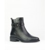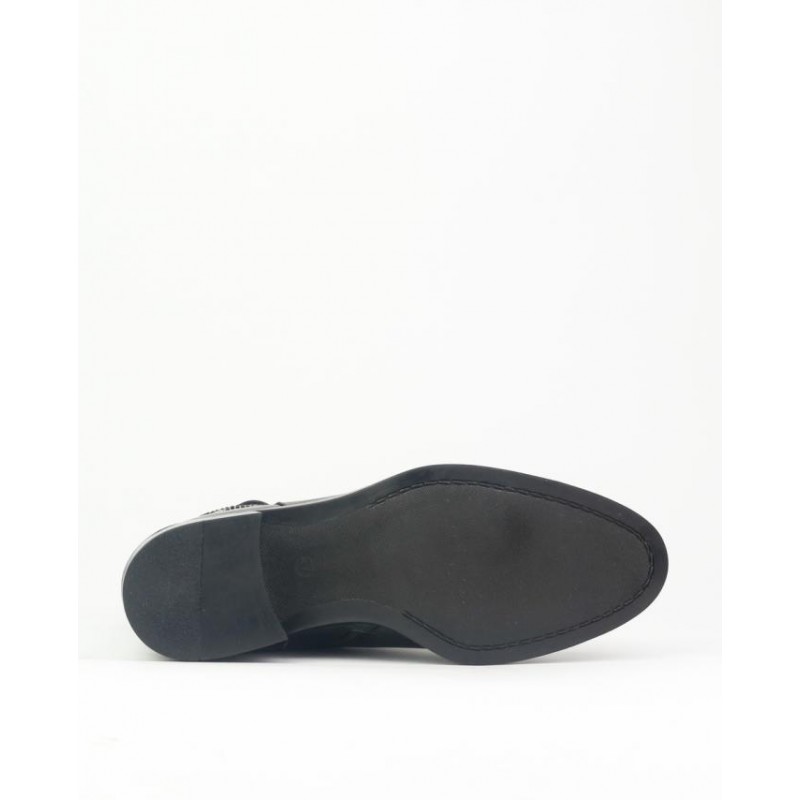 Botin marca Caramelo fabricado en piel vacuno nacional de calidad superior. Forro combinado piel con textil para mejorar confort. Detalle hebilla con piedras decorativas. Cremallera interior para facilitar puesta y retirada del pie. Suela goma para mejorar el agarre. Detalle metalico en suela. Altura de tacón 4 cm y 1 cm de plataforma.