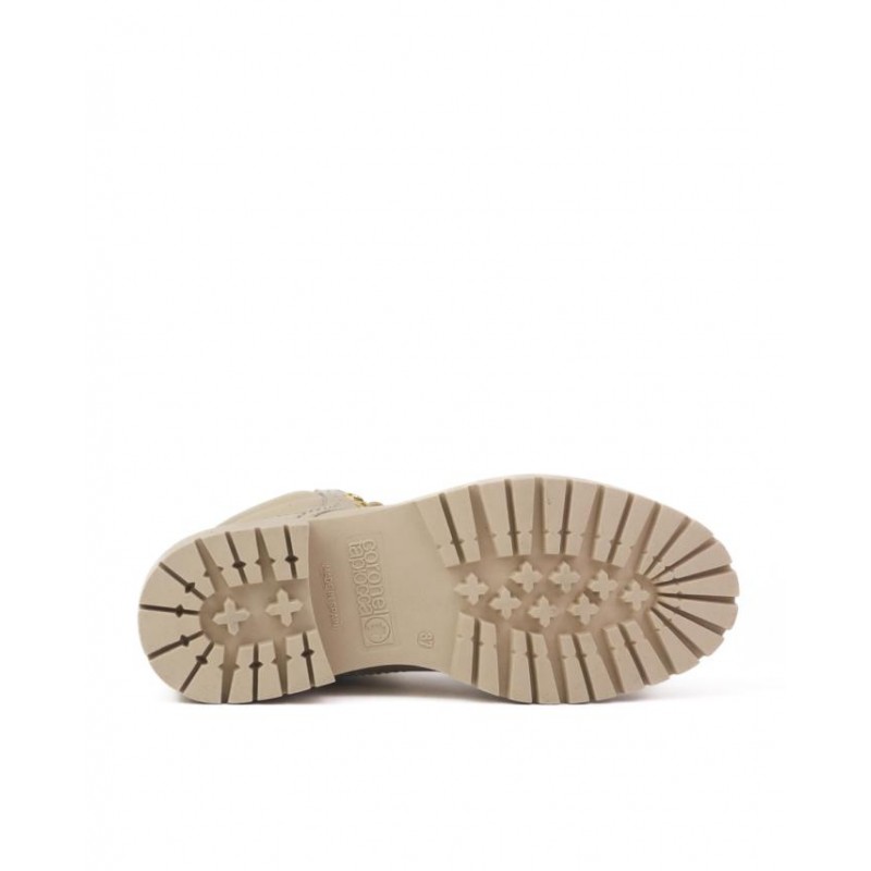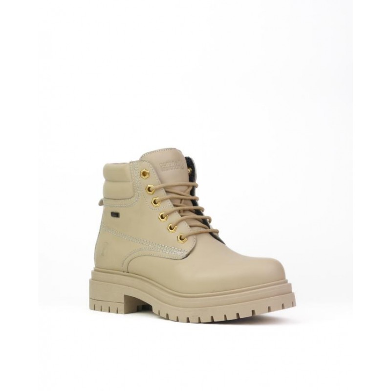 Botas impermeables Coronel Tapiocca. Fabricados en piel vacuno de color Beige. Altura de caña 12 cm. Cierre cordones para ajuste al pie. Forro textil con membrana repelente al agua y tecnologia XDRY. Plantilla extraible en eva termoconformada muy cómoda en textil. Suela con tacón de 4.5 cm y plataforma de 3 cm. Fabricado en España en instalaciones propias.