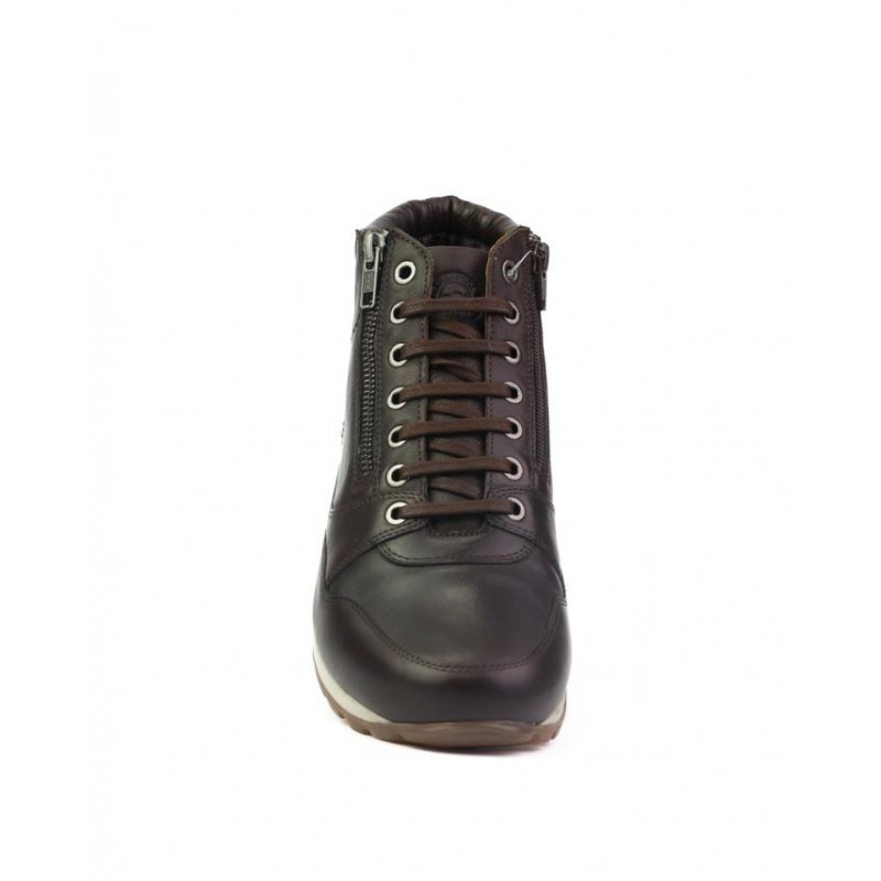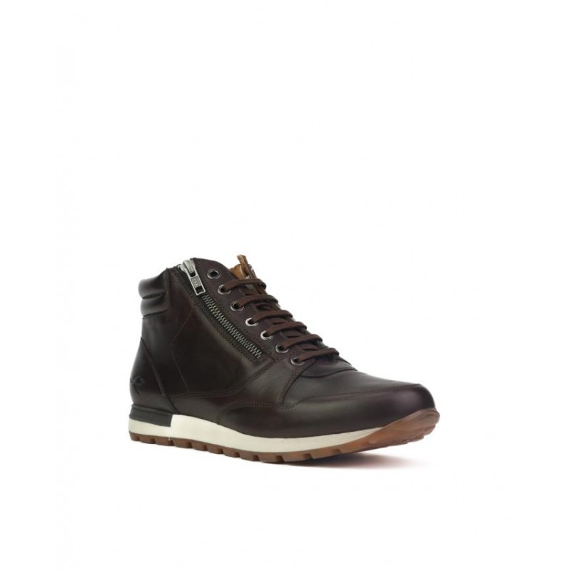 Botines KangaROOS hombre. Fabricados en piel vacuno de primera clase en color marron oscuro. Cierre cordones para ajustar al pie y una doble cremallera interior y exterior, para facilitar puesta y retirada del pie. Forro interior en piel vacuno combinado con textil. Plantilla extraible en material muy comodo. Altura de suela 2.5 cm. Fabricado en España en fabrica propia.