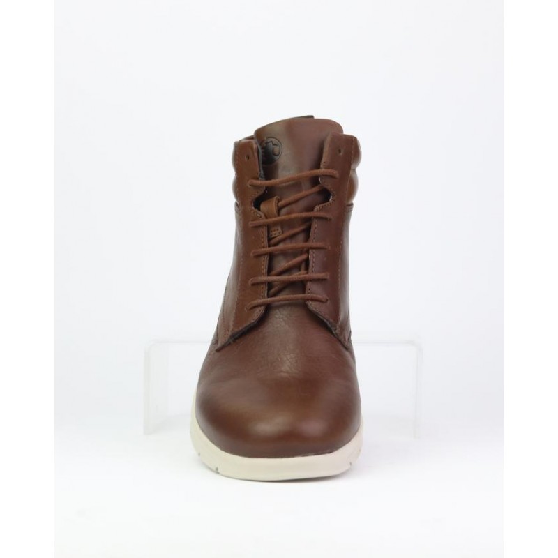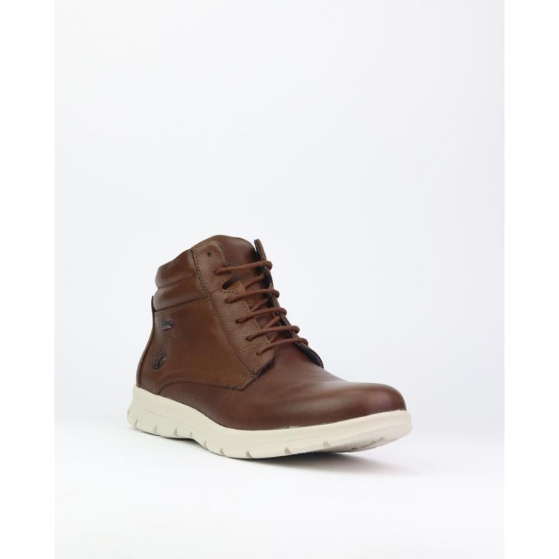 Botines Coronel Tapiocca Hombre en cuero. Fabricado en piel vacuno de calidad. Resistentes al agua. Forro vacuno combinado con tejido resisten al agua con membrana de tecnología XDRY. Altura de caña 9.5 cm. Tirador en tejido trasero. Cierre cordones. Cuello en serraje marrón. Plantilla extraible muy cómoda. Suela ligera de calidad PHYLON de 2.5 cm de altura. Fabricado en España.