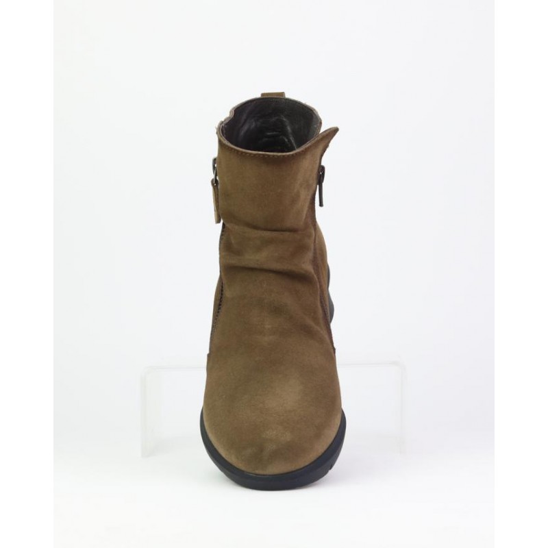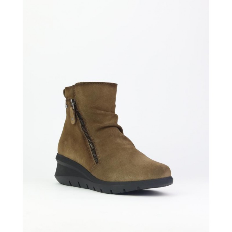 Botines Bajos KangaROOS mujer WATER RESISTANT. Botin en serraje taupe. Cierre cremallera interior para facilitar puesta y retirada, la cremallera exterior es solo decorativa. Forro en piel vacuno y tejido con membrana water resistant con tecnología XDRY. Plantilla interior en tejido extraible muy comoda. Altura de suela 5 cm y 1.5 de plataforma. Fabricado en España en instalaciones propias.