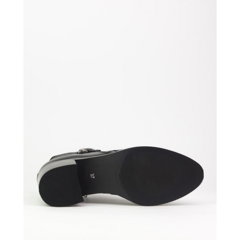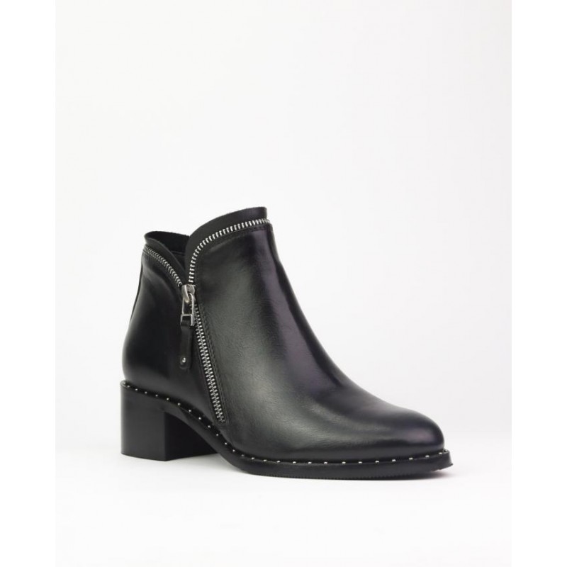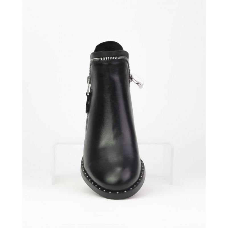 Botin fabricado en las mejores pieles vacuno en color negro. Cremallera lateral interior y exterior. Forro textil combinado con piel para aumentar la sensación de confort y calidez. Cremallera decorativa. Vira piel con detalles tachuelas metalicas. La altura del botin es de 10.5 cm. Altura de tacón 5 cm aproximados. Suela rallada que mejora el agarre. Composición: Empeine: Piel. Forro: Textil. Plantilla: Piel. Suela: Fibra sintética. Componente principal: Piel