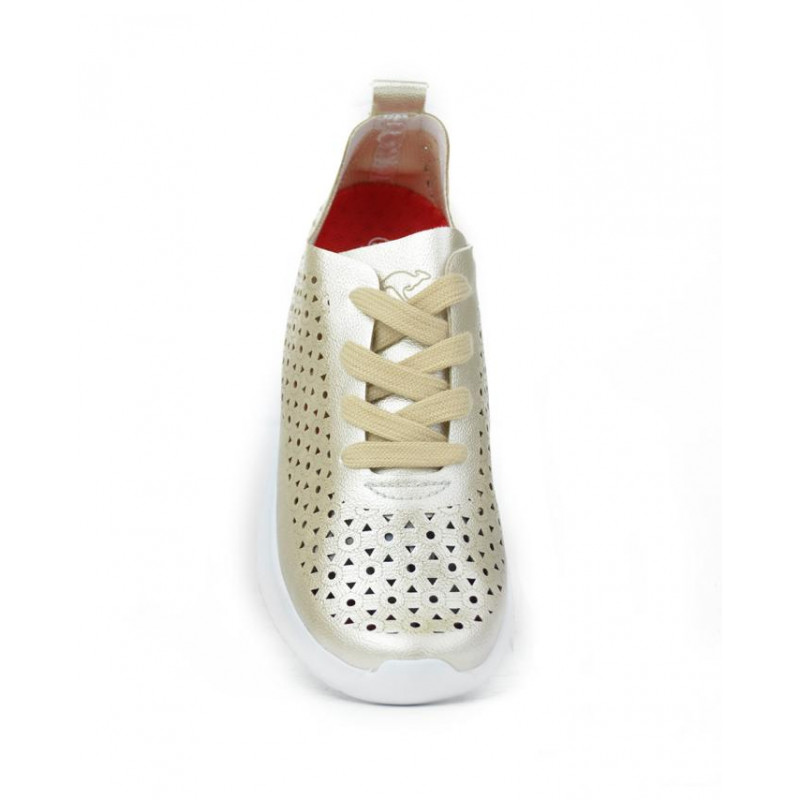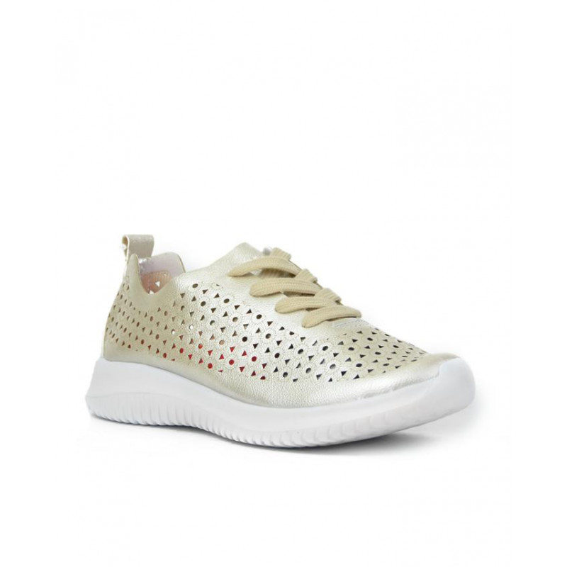 Zapatillas ligeras deportivas señora en color dorado,cierre de cordones, plantilla extraíble de textil, corte con figuras perforadas para una mejor transpiración, suela ligera de eva de 3 cm. altura. Composición: Empeine y forro: otros materiales. Plantilla: textil. Suela: eva.