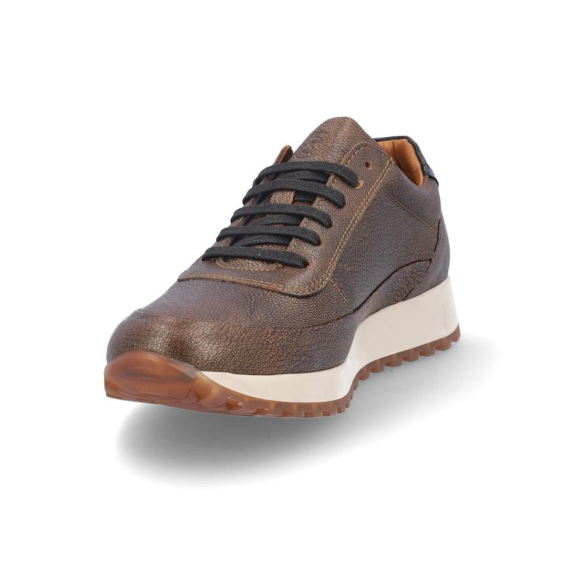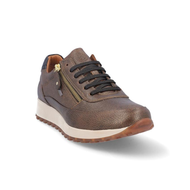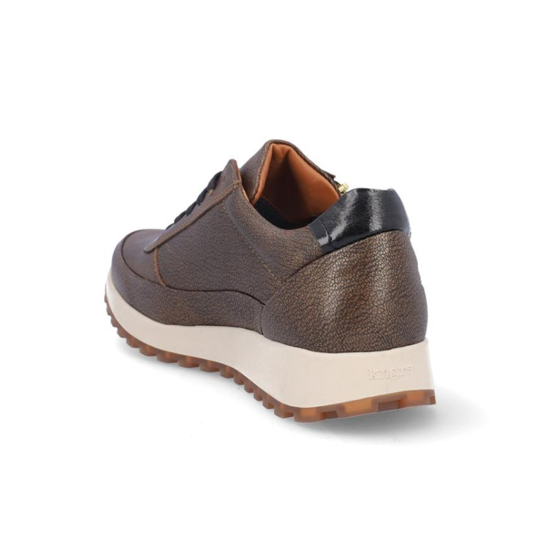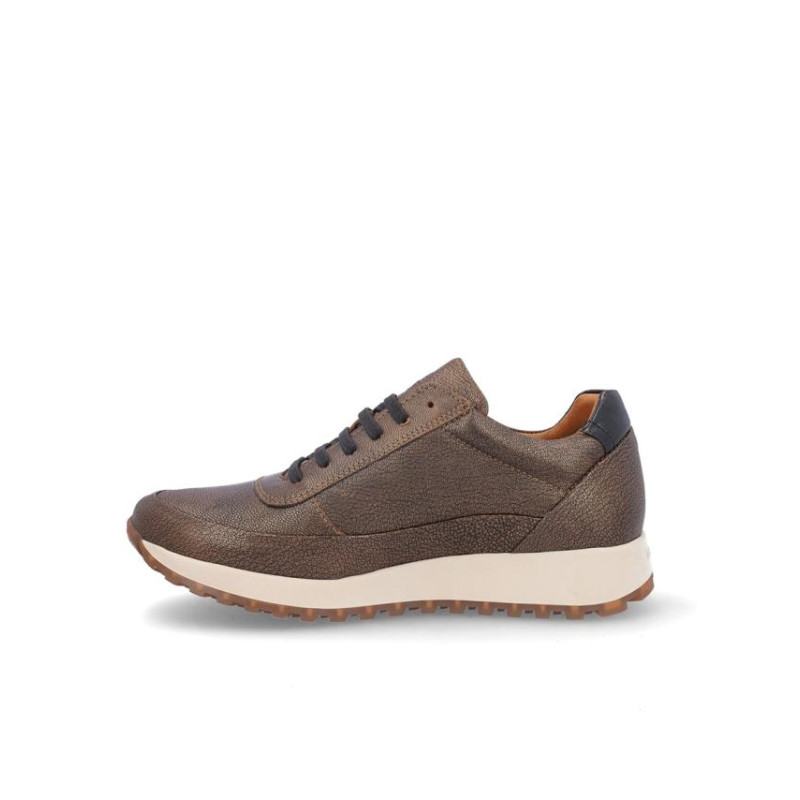 Deportivo de señora Kangaroos en piel color bronce metalizado, con membrana resistente al agua y tecnología XDRY. Cierre con cordones y cremallera en parte exterior para facilitar la puesta y retirada. Forro textil con vista de piel, plantilla textil extraíble termoconformada, suela de 3 cm altura. Composición: Empeine: Piel. Forro: Piel/textil. Plantilla: Textil. Suela: Fibra sintética. Componente principal: Piel