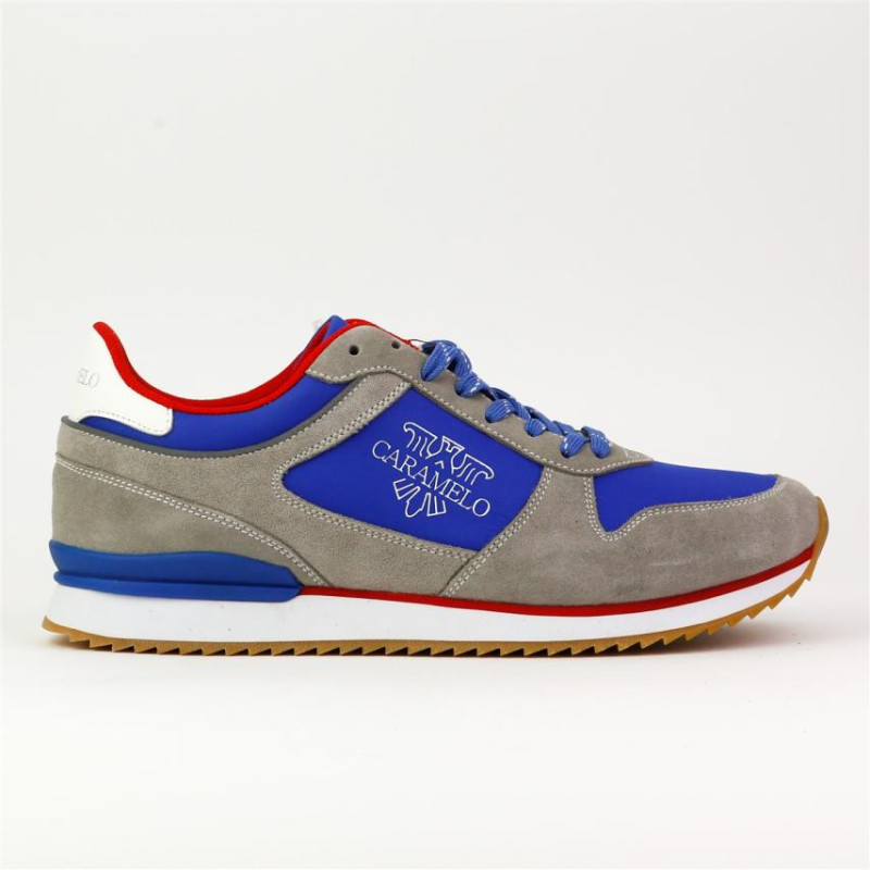 SNEAKER CABALLERO SERRAJE GRIS COMBINADO AZUL. CORDONES PISO LIGERO MICRO. ESTABILIZADOR TRASERO.