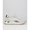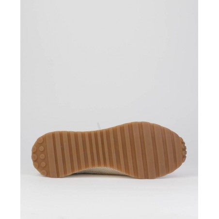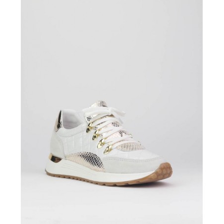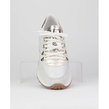 Sneakers señora Caramelo. Combinado piel y sintético con adornos metalizados. Forro textil. Suela blanca con adorno trasero metalizado. Cierre con cordones.