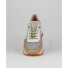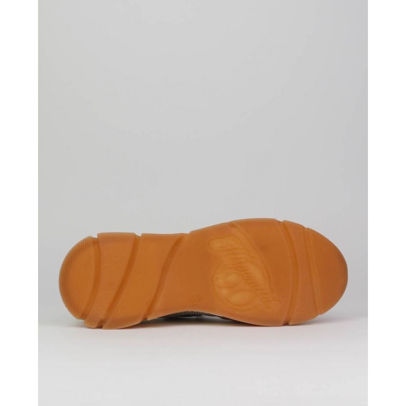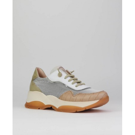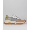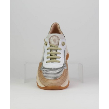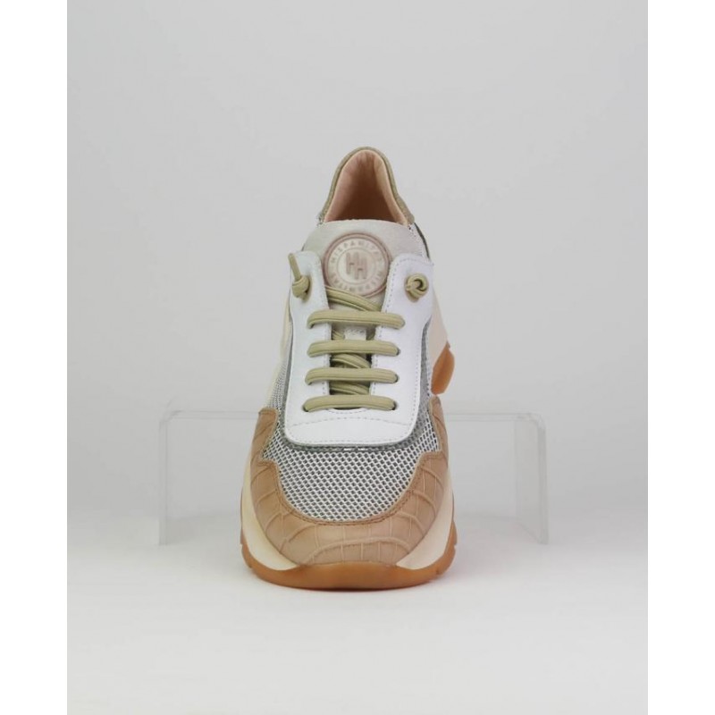 Sneakers señora perforado Hispanitas. Combinado piel con textil, Forro combinado. Doble suela 5cm aprx. Cierre cordones.