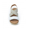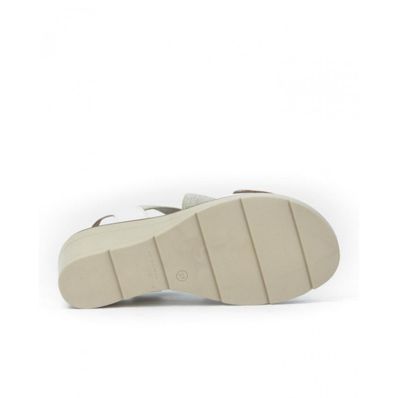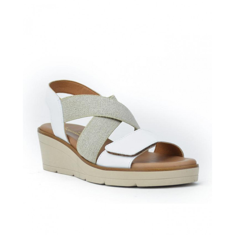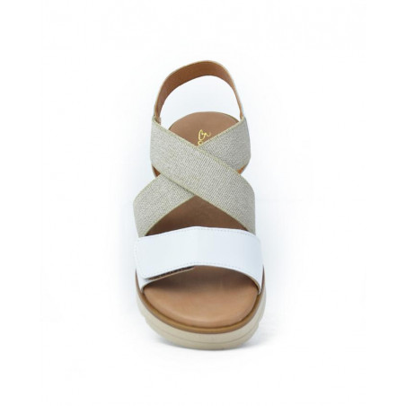 Sandalia marca Bonaventure modelo sandalia confort elastico velcro delantero. Fabricado en piel color blanco, cierre con velcro, plantilla acolchada personalizada. Suela personalizada.