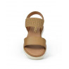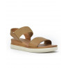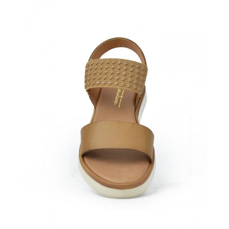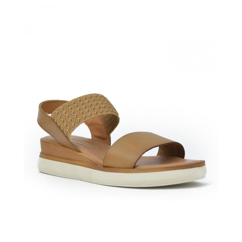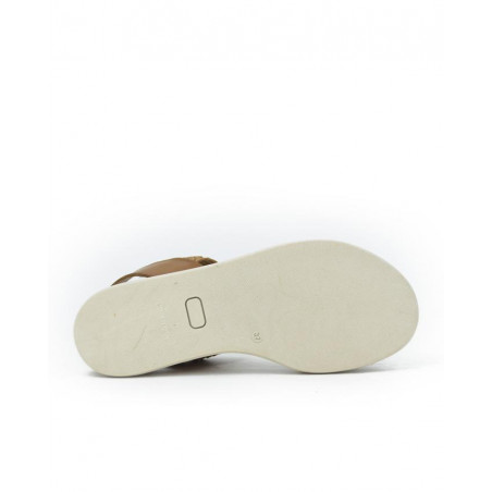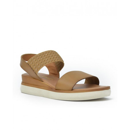 Sandalia marca Bonaventure modelo sandalia cuña cruzada velcro trasero. Fabricado en piel color cuero, cierre con velcro trasero, plantilla acolchada personalizada. Suela personalizada.