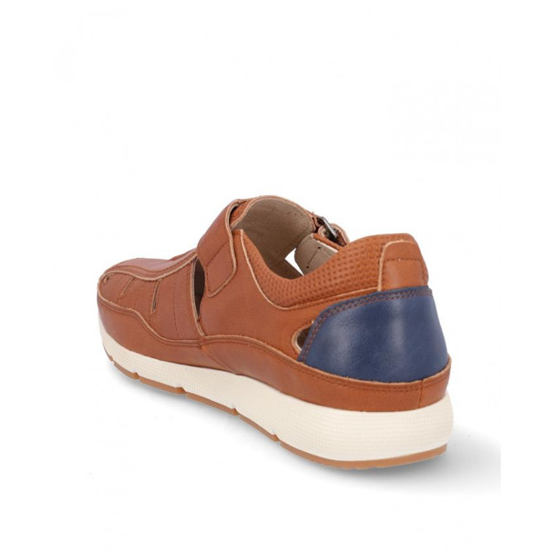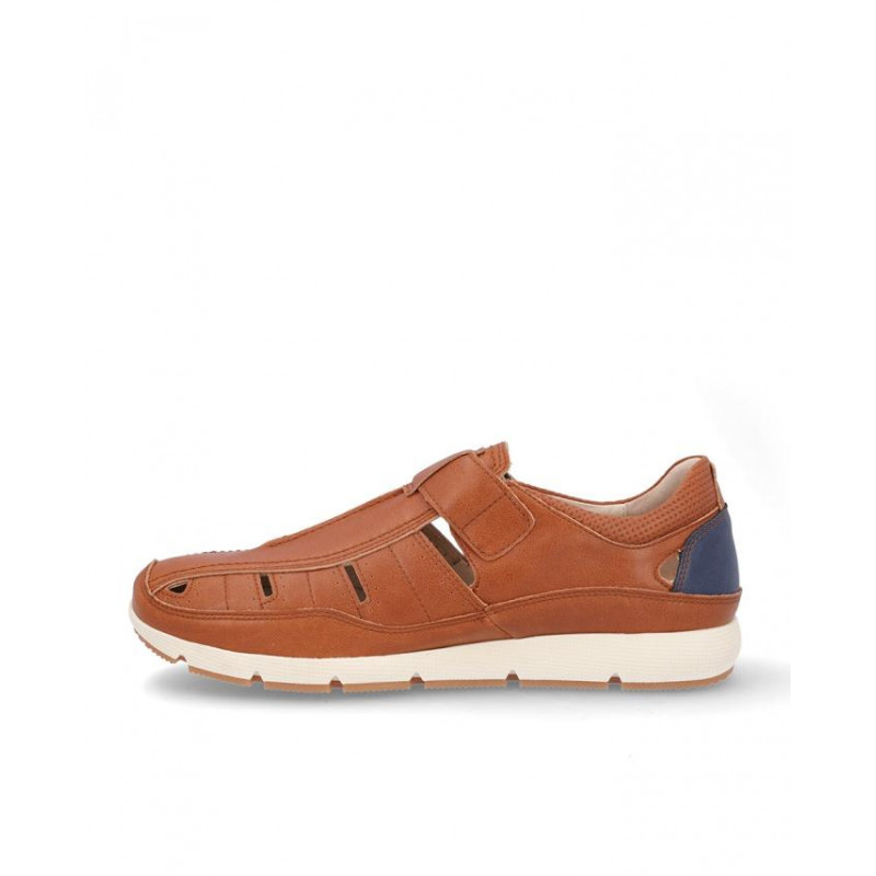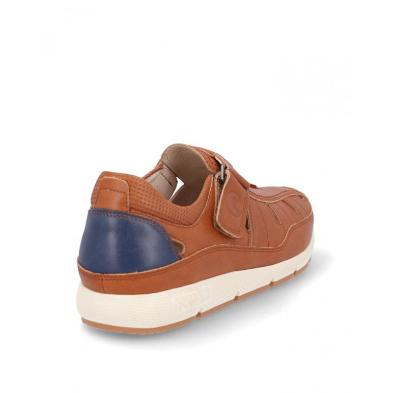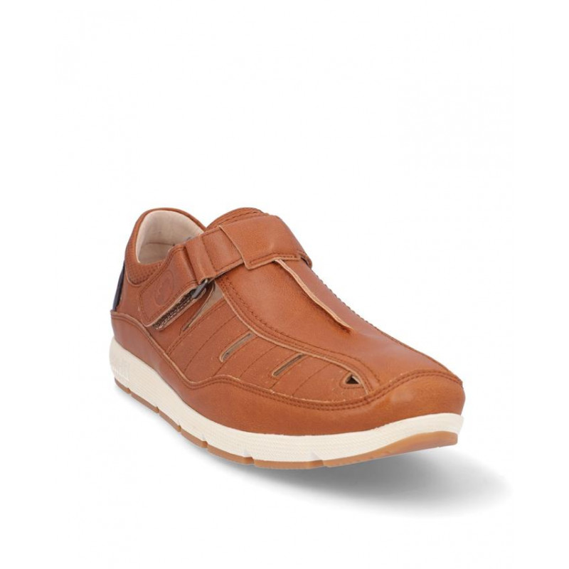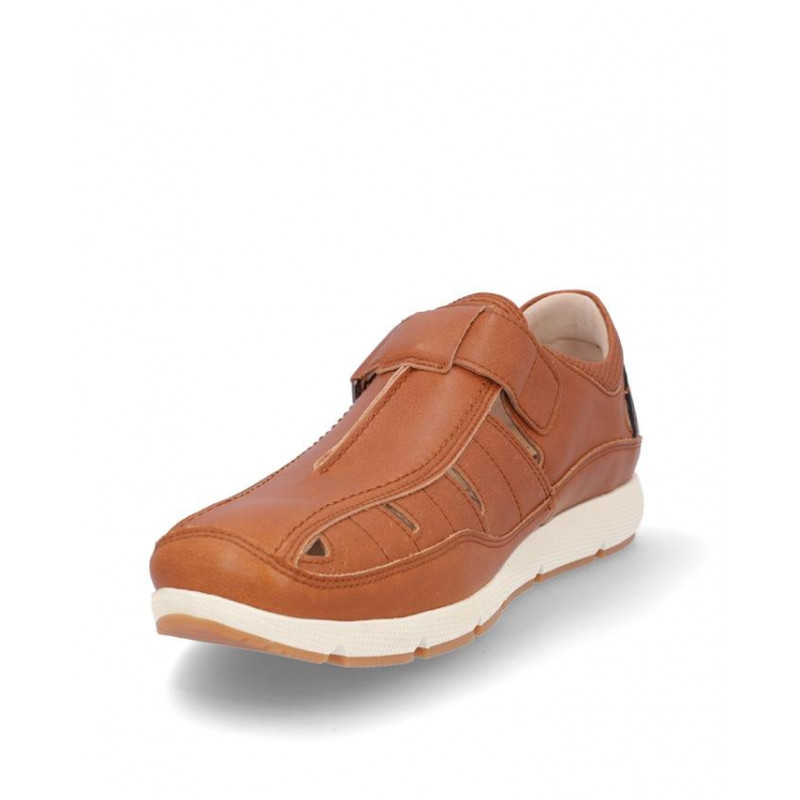 Zapato abierto Coronel Tapiocca fabricado en piel camel, cierre de velcro, forro de piel, plantilla extraible textil, suela ligera de 2,5 cm altura. Composición: Empeine: Piel. Forro: Piel. Plantilla: Textil. Suela: eva+caucho. Componente principal: Piel