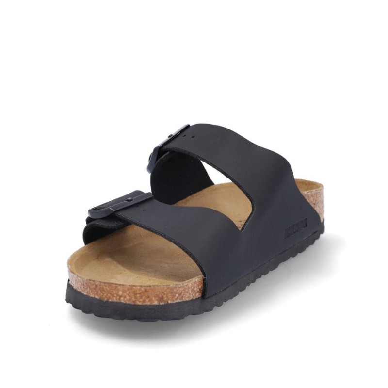 Sandalia marca Birkenstock modelo 2 hebillas arizona birko flor. Fabricado en color negro, con dos hebillas delanteras. Suela personalizada.