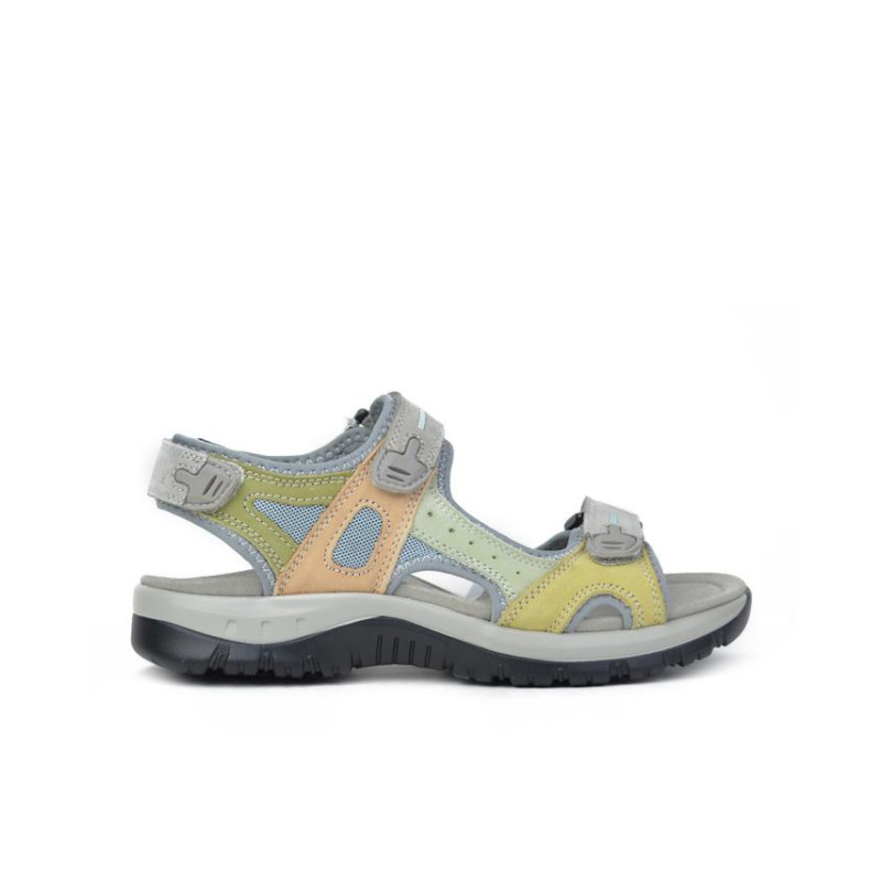 Sandalia señora piel nobuck multicolor gris/verde/amarillo, forro textil, cierre de velcro, suela ligera de 2,5 cm altura, planta bio de microfibra transpirable. Composición: Empine: Piel. Forro y planta: Textil. Suela: Fibra sintética. Componente principal: Piel
