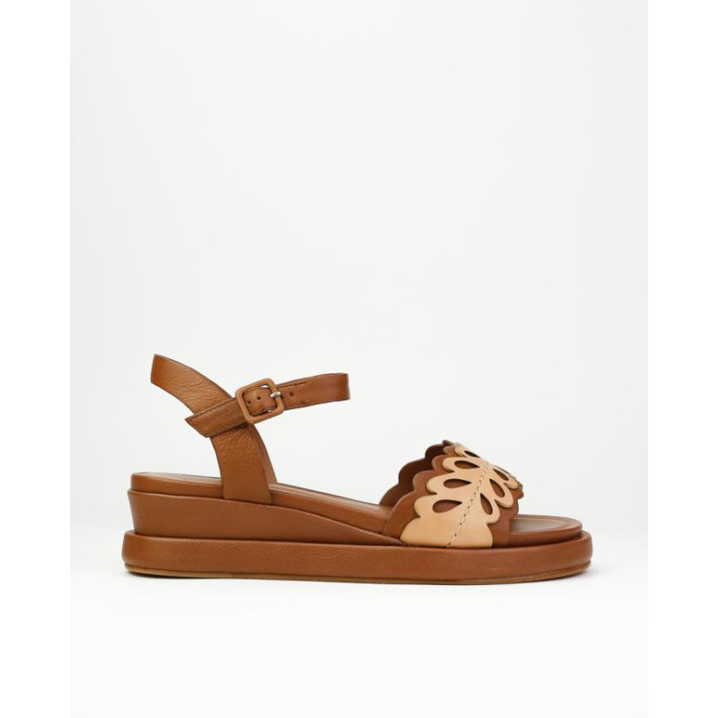 Sandalia señora piel, forro piel con cuña forrada. Cierre hebilla, cuero combinado con nude