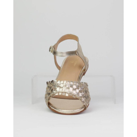 Sandalias piel mujer Oro metalizado marca Caramelo. Fabricadas en piel vacuno noble de primera calidad. Constad de dos piezas, una pala delantera formada por una piel trenzada y una segunda pieza trasero, con una hebilla y un pequeño elastico para un mejor ajuste al pie. Altura de tacon 1.5cm. Forrado en piel vacuno color cuero mezclado con piel oro en puntera.