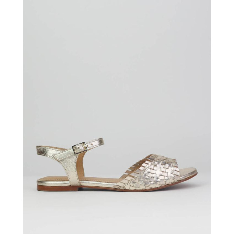 Sandalias piel mujer Oro metalizado marca Caramelo. Fabricadas en piel vacuno noble de primera calidad. Constad de dos piezas, una pala delantera formada por una piel trenzada y una segunda pieza trasero, con una hebilla y un pequeño elastico para un mejor ajuste al pie. Altura de tacon 1.5cm. Forrado en piel vacuno color cuero mezclado con piel oro en puntera.