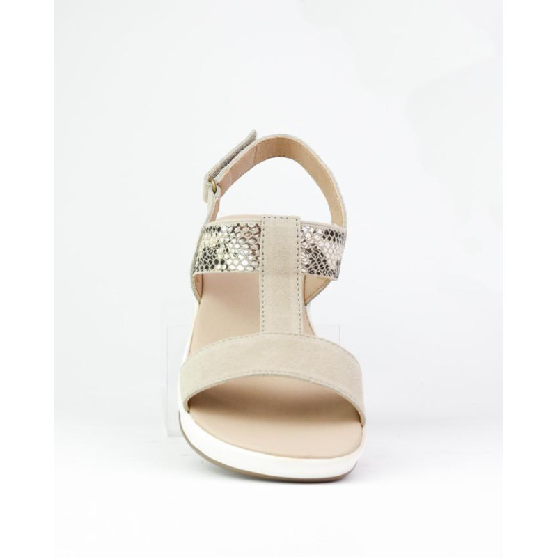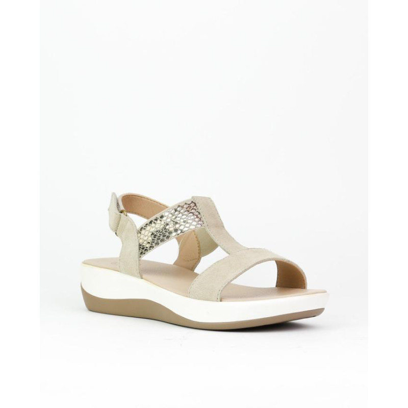 Sandalia serraje hielo combinado con elastico simil serpiente. Cuña de 4 cm y plataforma de 2cm. Planta perforada.