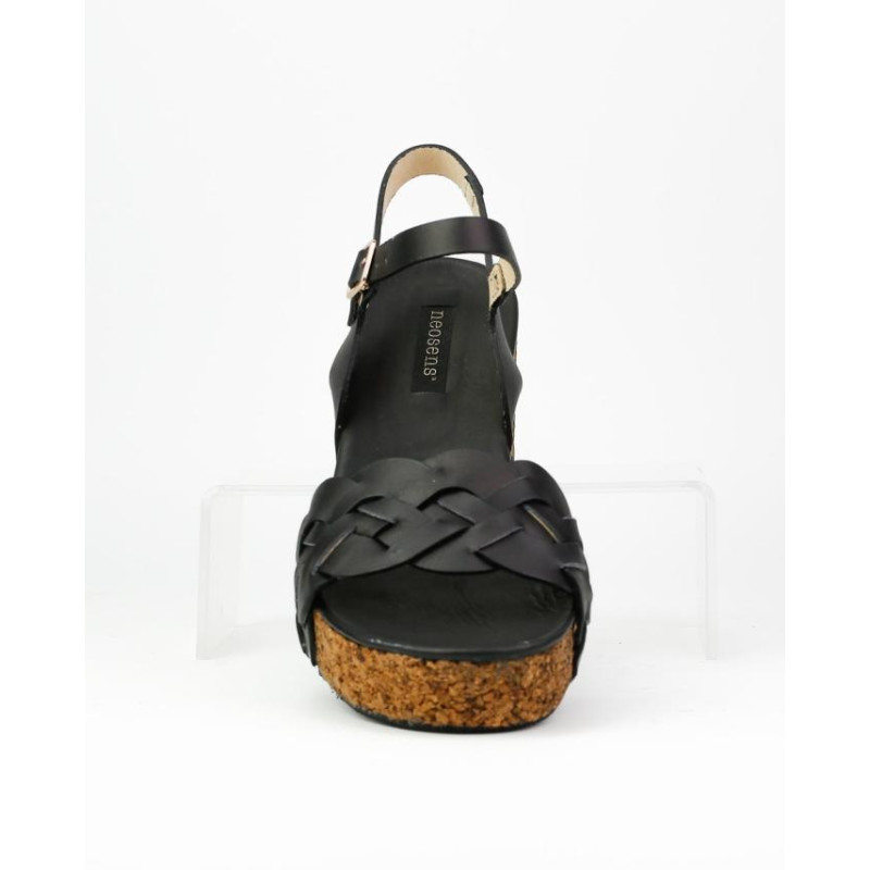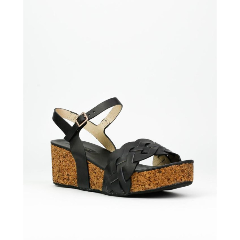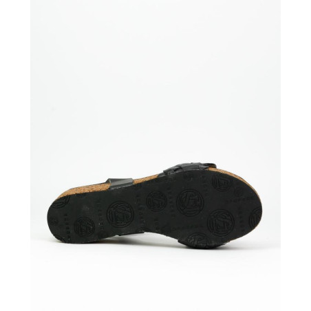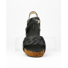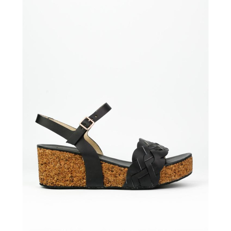 Sandalia cuña dos piezas piel negro. Cierre hebilla.