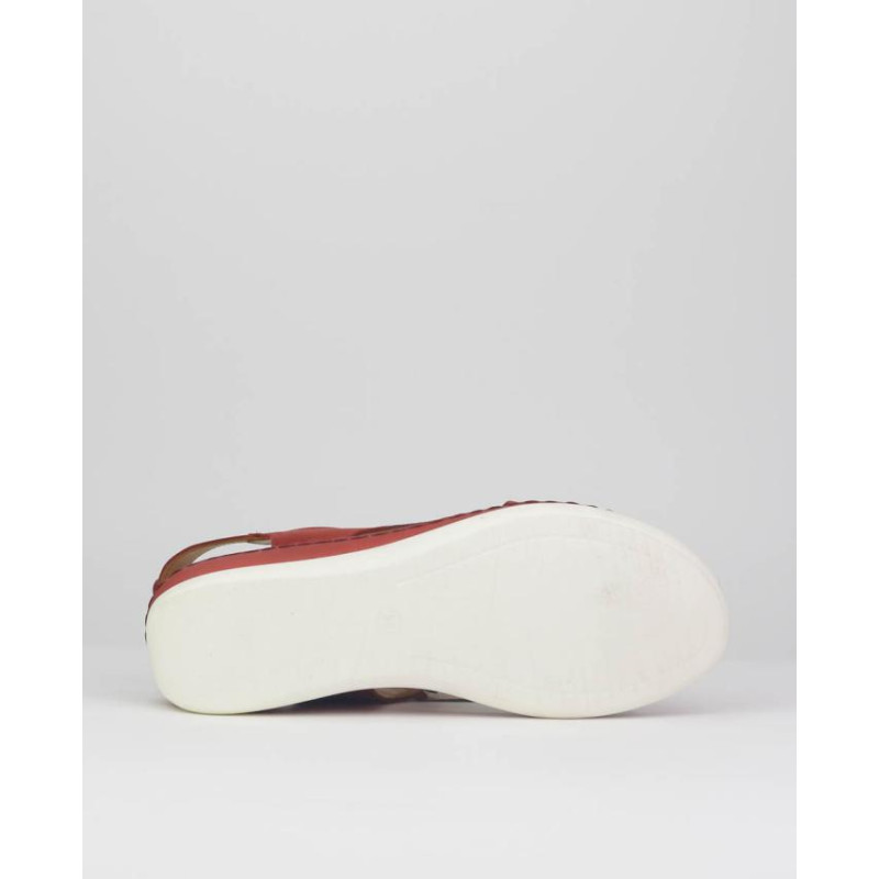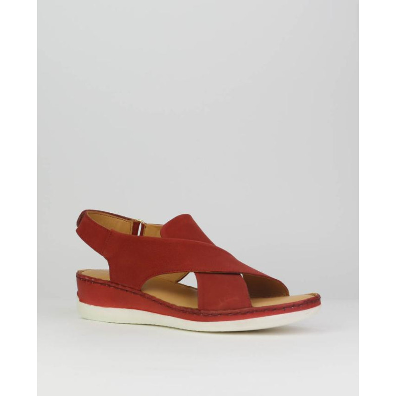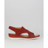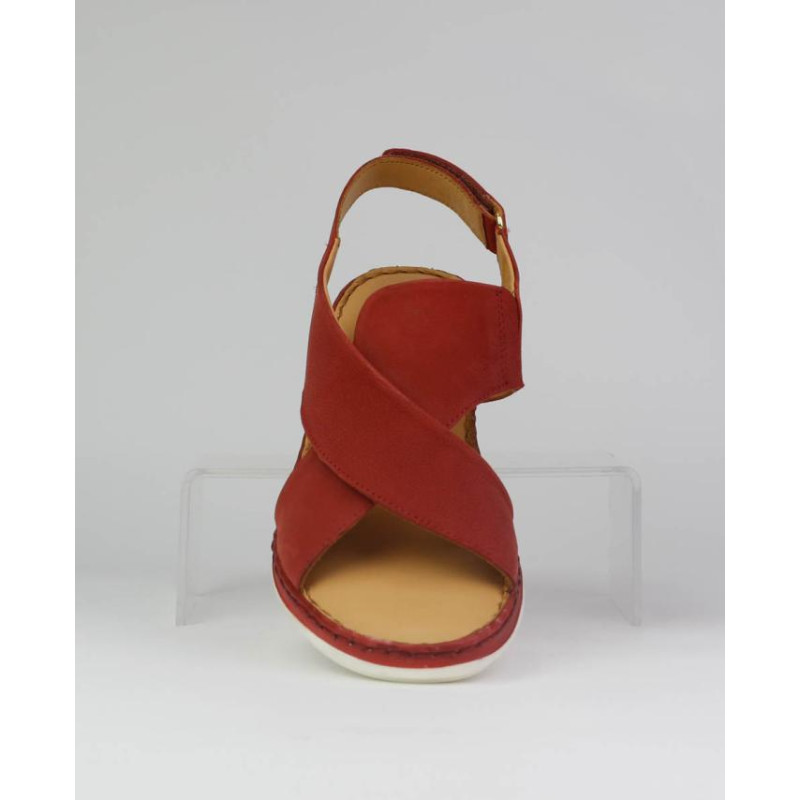 Sandalia con velcro mujer Elio Berhanyer. Fabricadas en piel nobuck rojo, con forro vacuno en color cuero, tanto en corte como planta. Planta acolchada muy cómoda. Cierre velcro trasero para un mejor ajuste al pie. Formado por dos piezas cruzadas en empeine para su sujección. Suela fabricada en poliuretano ligero, con 3.5 cm de altura