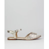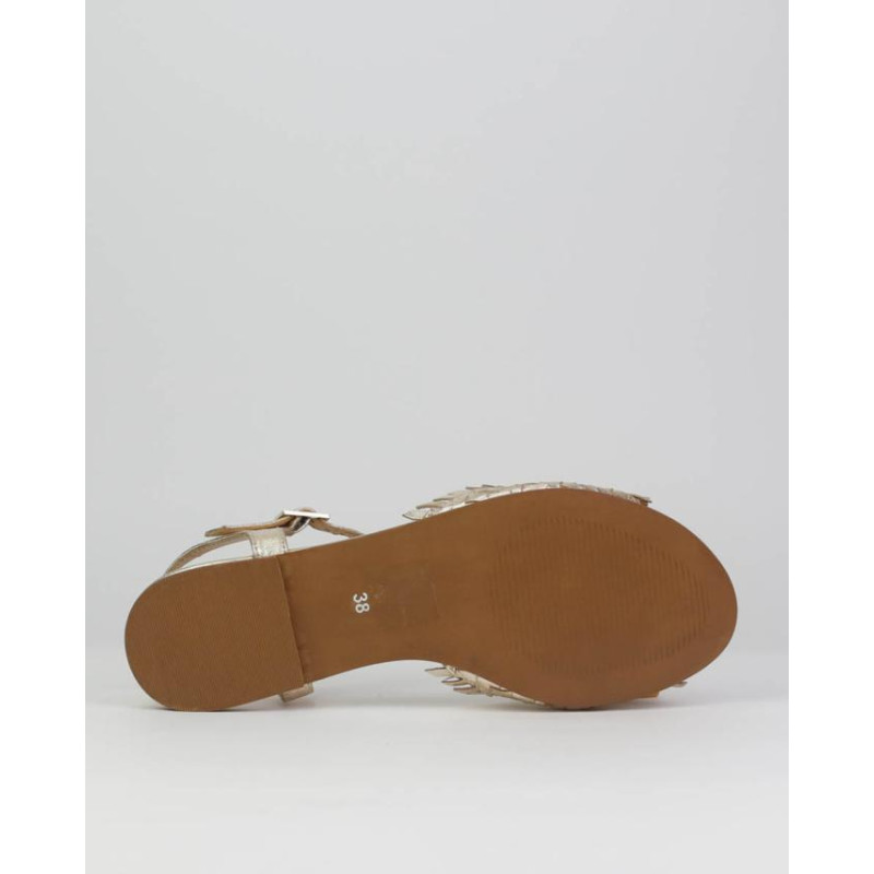 Sandalias piel mujer Oro metalizado marca Caramelo. Fabricadas en piel vacuno noble de primera calidad. Constad de dos piezas, una pala delantera formada por una piel trenzada y una segunda pieza trasero, con una hebilla y un pequeño elastico para un mejor ajuste al pie. Altura de tacon 1.5cm. Forrado en piel vacuno color cuero mezclado con piel oro en puntera.