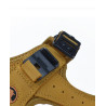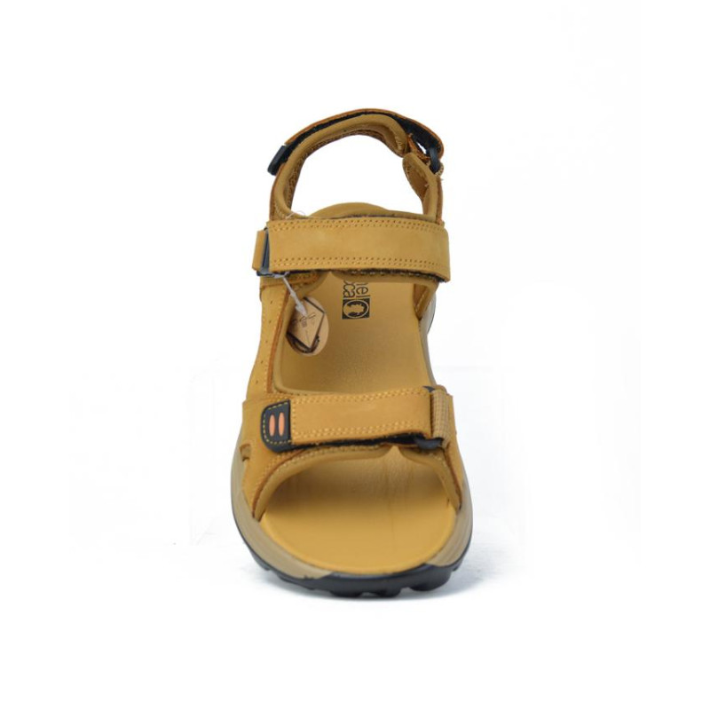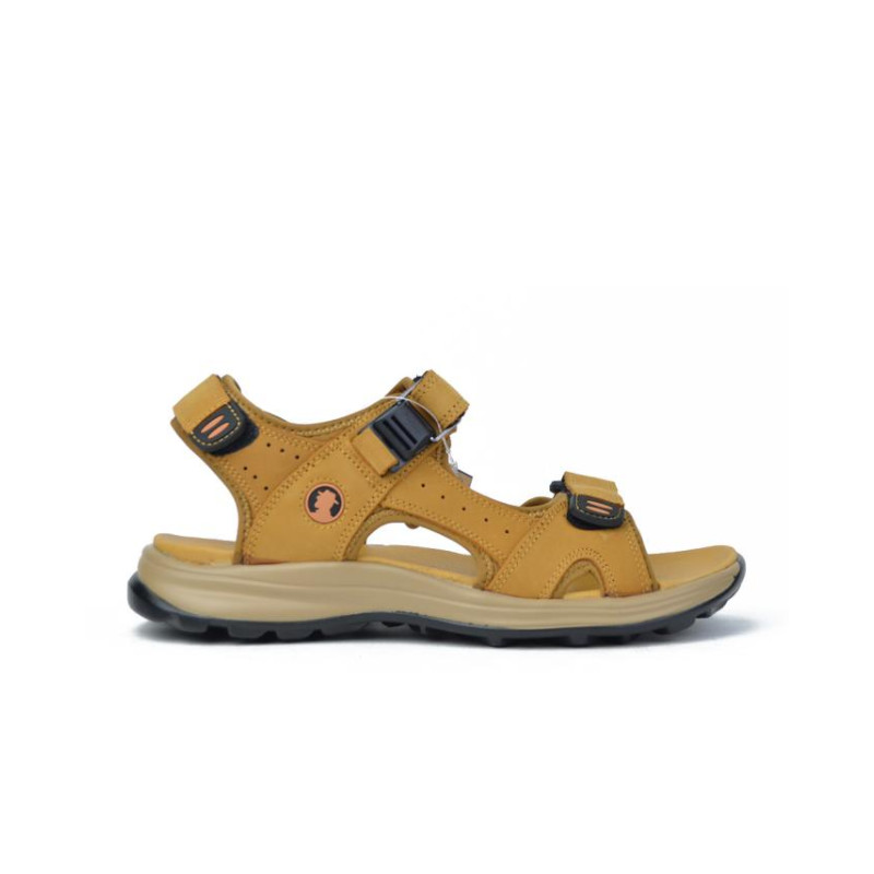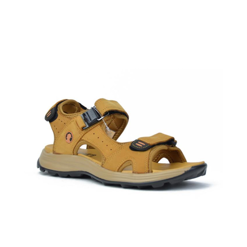 Sandalia hombre en piel mostaza. Tres velcros para mejor ajuste. El velcro superior finaliza en pieza imantada, para no tener que desmontar el velcro y facilitar su puesta y retirada. Forro tejido. Planta microfibra transpirable. Suela phylon ligero. Suela goma.