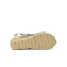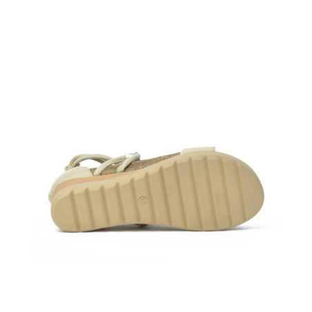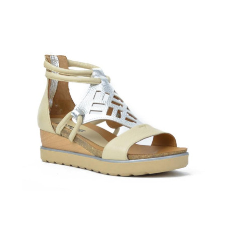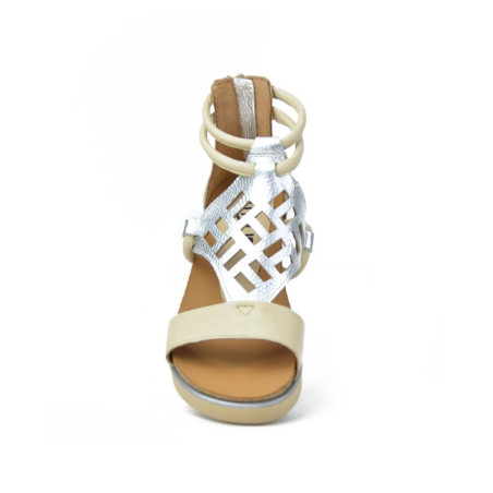 Sandalia marca MJUS modelo sandalia cuña. Fabricado en piel color beige y plata, cierre con cremallera en la parte de atras. Suela corrida personalizada.