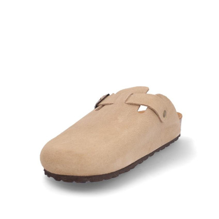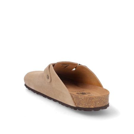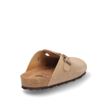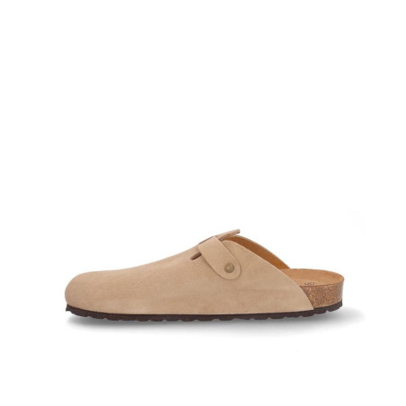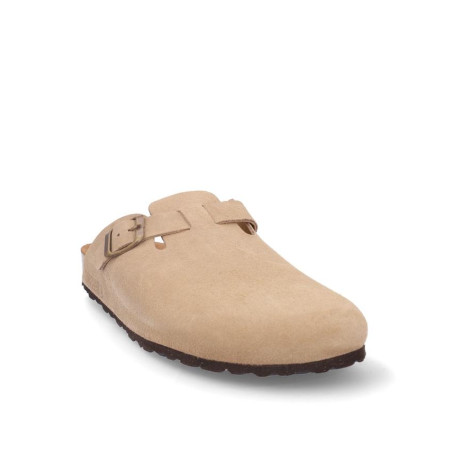 Zueco caballero fabricado en serraje beige con hebilla laterial, altura planta bio acolchada, fabricado en España. Composición: Empeine: Piel. Forro: Piel. Planta: Piel. Suela: Fibra sintética. Componente principal: Piel
