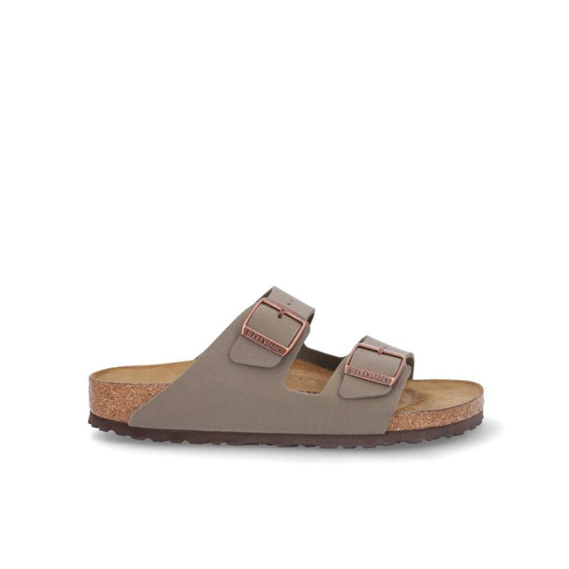 Sandalia marca Birkenstock modelo 2 hebillas arizona birko flor. Fabricado en color piedra, con dos hebillas delanteras. Suela personalizada.