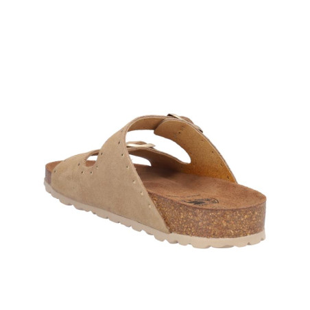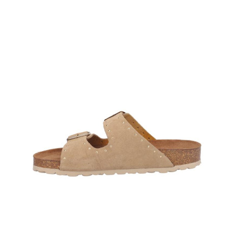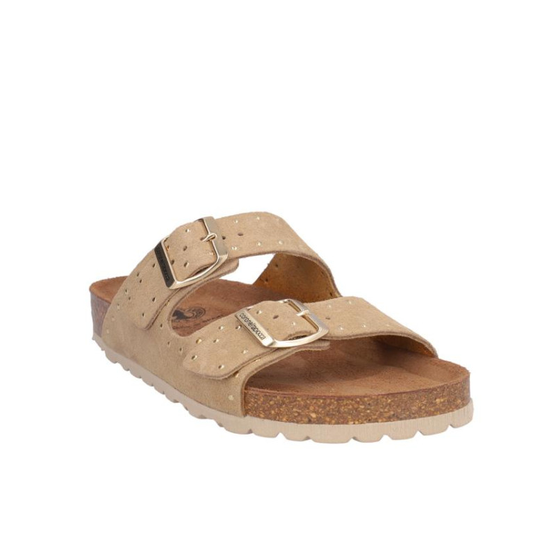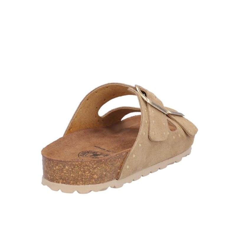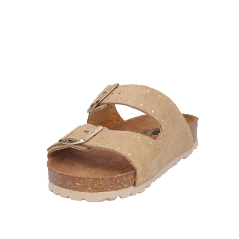 Sandalia señora Coronel Tapiocca en serraje arena con adornos metálicos, cierre de dos hebillas, altura planta bio acolchada, fabricado en España. Composición: Empeine: Piel. Forro: Piel. Planta: Piel. Suela: Fibra sintética. Componente principal: Piel