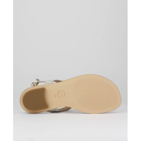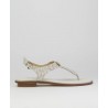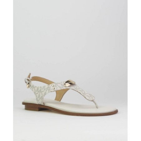 Sandalia mujer plana estampado logotipo MK. Placa fontral iniciales Michael Kors. Polipiel. Forro polipiel. Suela plana. Punta abierta y cierre con hebilla.