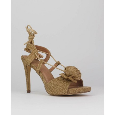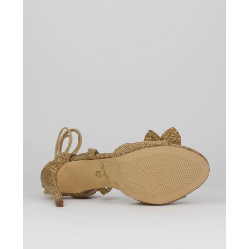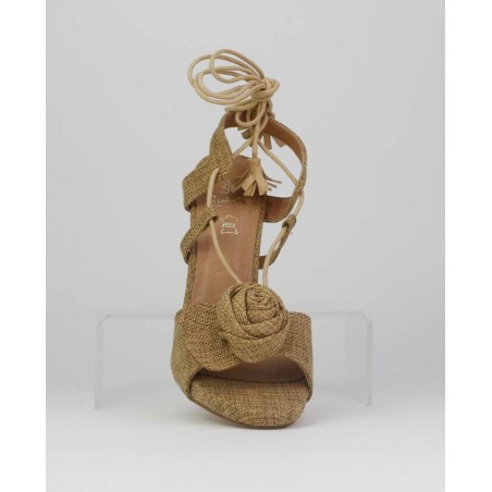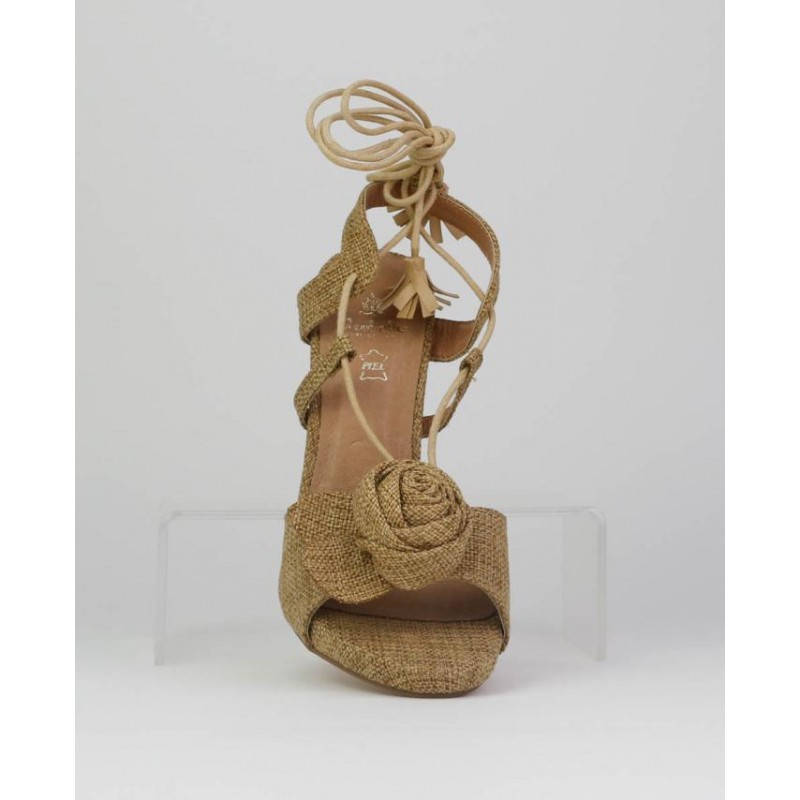 Sandalia tacón señora rafia con cuerdas EL CABALLO. Adorno flor en rafia. Combinado piel con textil. Tacón 10cm. Cierre cuerdas.
