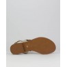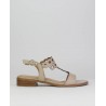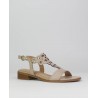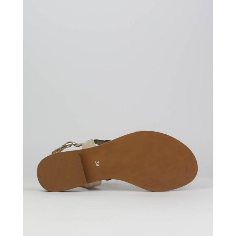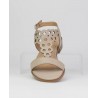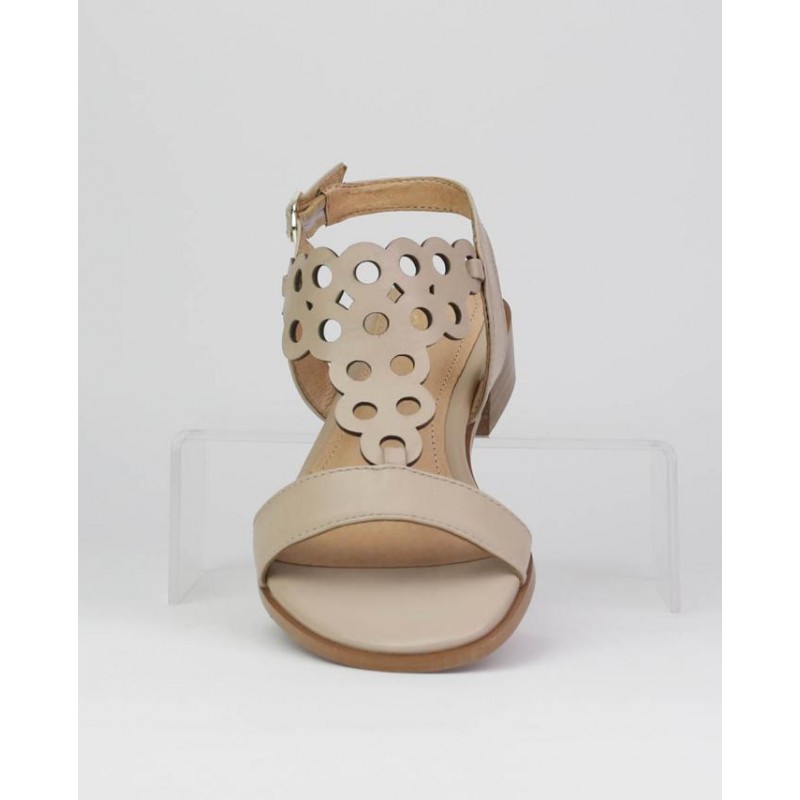 Sandalia mujer piel Beige marca Caramelo. Fabricadas en pieles nobles de primera calidad vacuno. Forrada al tono en piel. Formada por tres piezas, una trasera que tiene una hebilla con un pequeño elastico para mejorar el ajuste al pie, una pieza troquelada de piel en forma de circulos y una pala delantera para cubrir el nacimiento de los dedos. Altura de suela 3 cm desde el tacón hasta la planta. Pequeñas inserciones en la suela para mejorar el agarre.