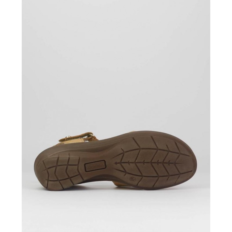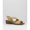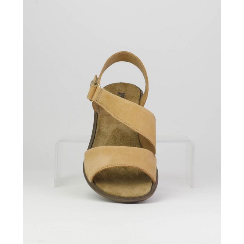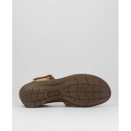 Sandalia piel marca Imac. Fabricado en nobuck camel, son tres piezas, una pala, un tira ajustable mediante velcro a un trasero. Forro de tejido. Altura de suela 3cm. Fabricado en Italia.