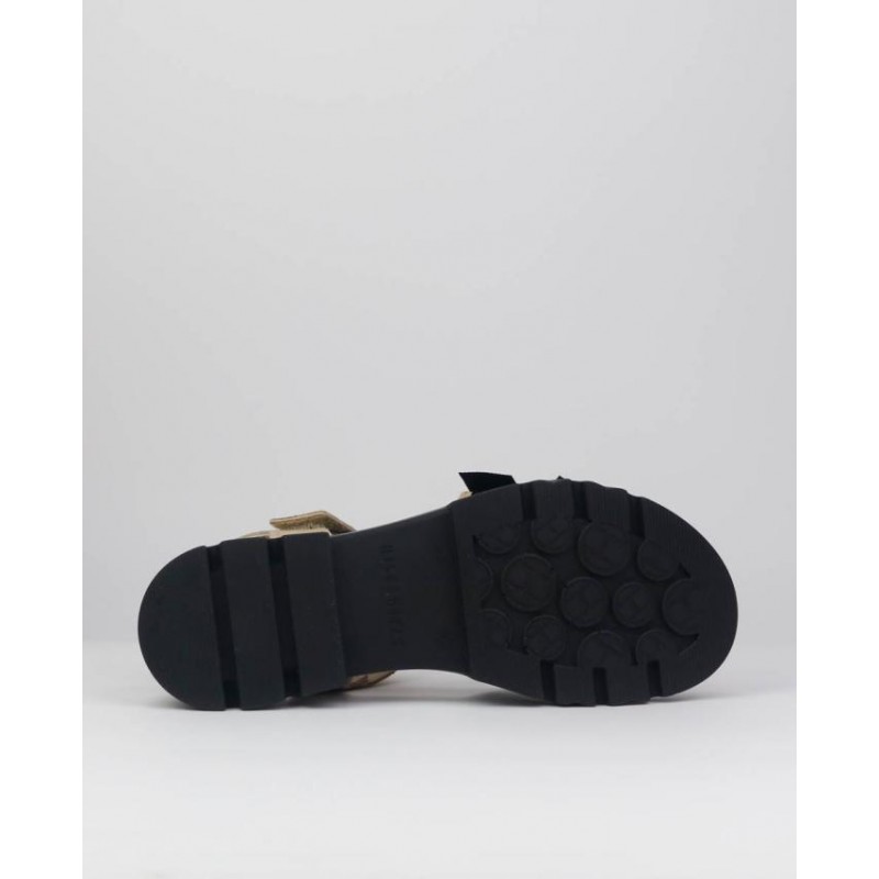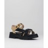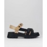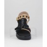 Sandalia mujer plantaforma. Fabricado en color beige piel combinado con detalles negros en cinta y elasticos, llevan incrustados unas piramides metálicas forradas en su parte trasera para no dañar el piel. Suela negra. Altura 4.5 cm aprox. Planta de material negro. Forro de piel