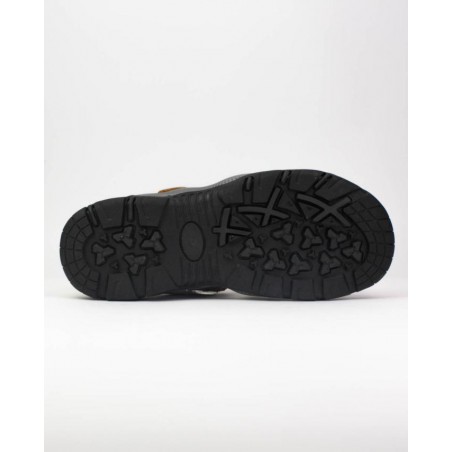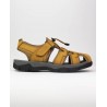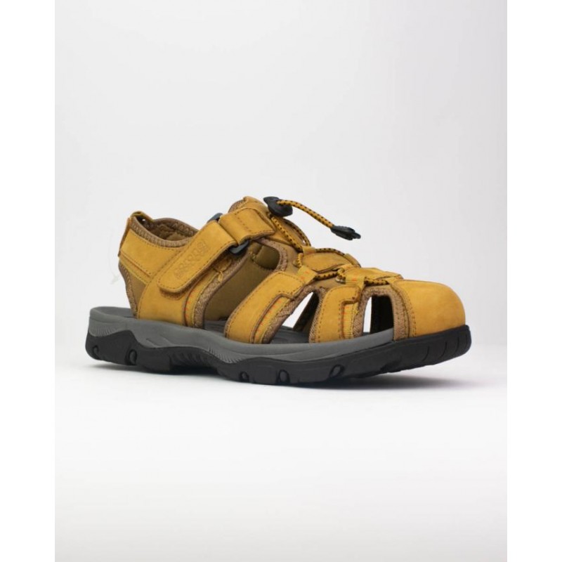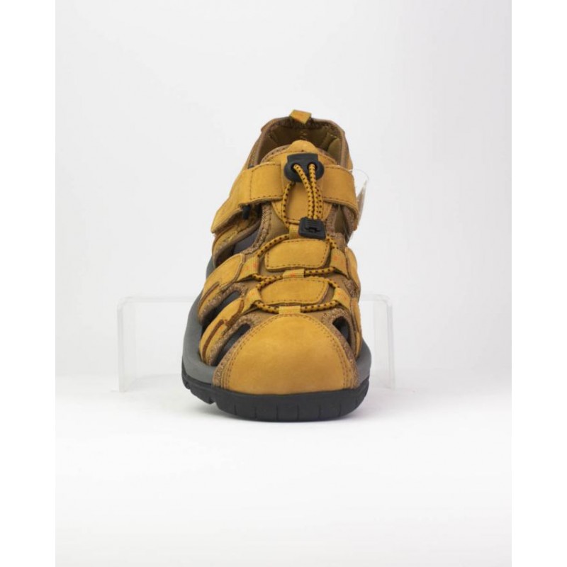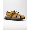 Sandalia de piel en color mostaza. Cierre velcro. Plantilla eva resistente al agua. Suela mas plantilla una altura de 3cm. Forro tejido.