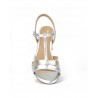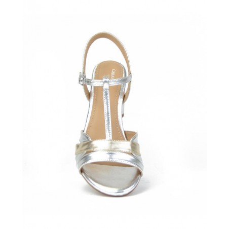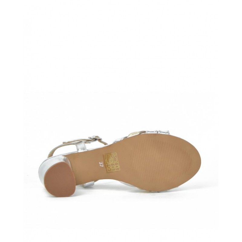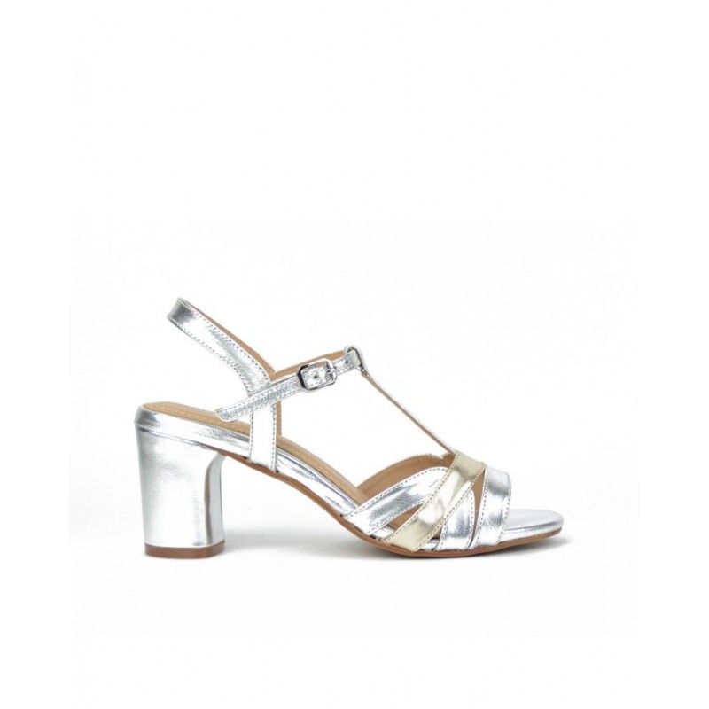 Sandalia piel metalizado plata. Tiras en la pala y cierre hebilla para ajuste al pie. Forro de piel. Altura de tacón 6 cm aprox.