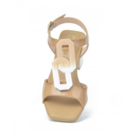 Sandalia charol tacon Hispanitas. Color dessert. Detalle imitacion eslavones de cadena en pala. Tacón de 4 cm aprox.