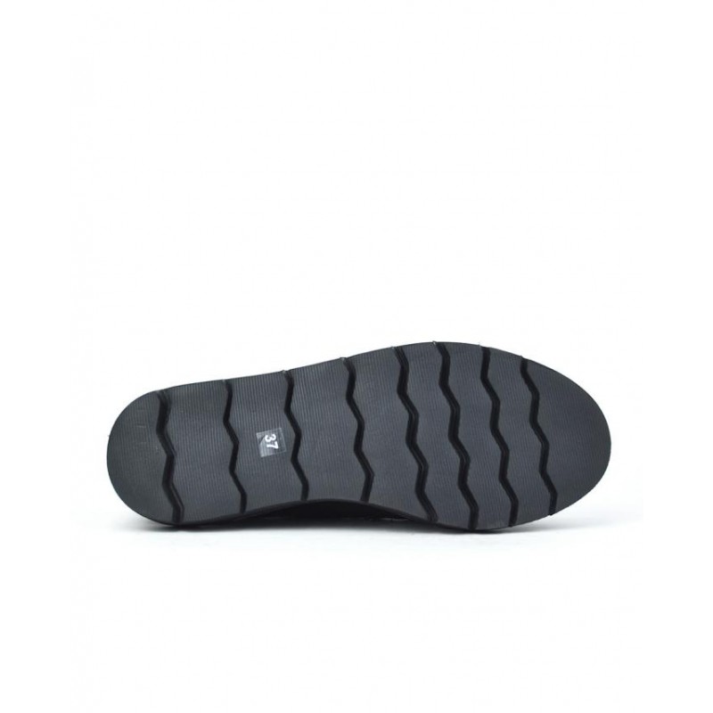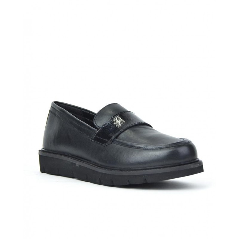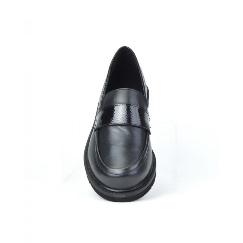 Mocasín señora de Javier Larrainzar fabricados en piel y charol negro, forro piel y textil, plantilla de piel, suela ligera de eva de 2,5 cm altura. Composición: Empeine: Piel. Forro: Piel y Textil. Plantilla: Piel. Suela: Eva. Componente principal: Piel.