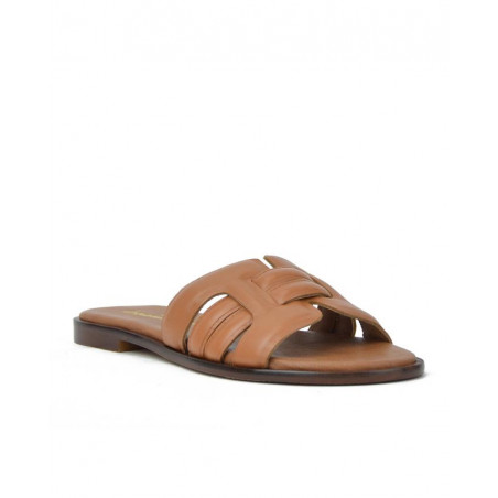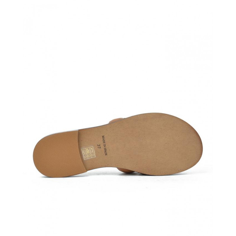 Zueco marca Bonaventure modelo zueco plano pala acolchada. Fabricado en piel color cuero, plantilla acolchada personalizada. Suela personalizada.