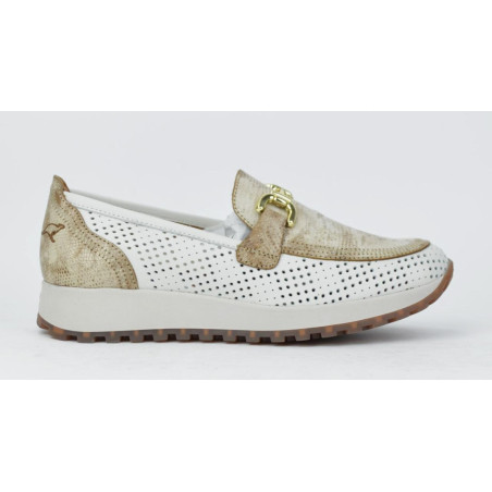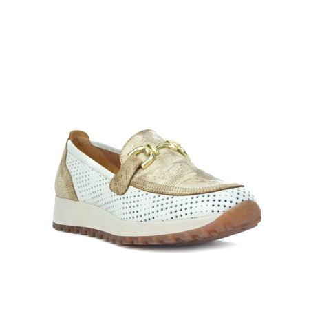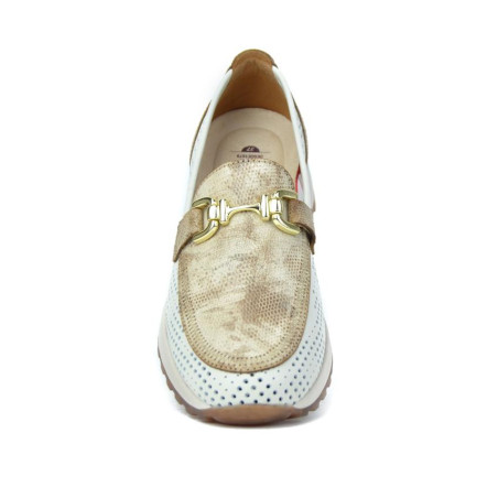 Mocasines señora Kangaroos fabricados en piel perforada hielo y serpe beige para una mejor transpiración, forro piel, plantilla textil extraible termoconformada, suela de 3 cm altura, adorno hebilla metálica en pala, fabricados en España. Composición: Empeine piel. Forro: Piel. Plantilla: Textil. Suela: Fibra sintética. Componente principal: Piel.