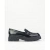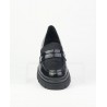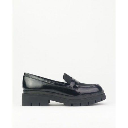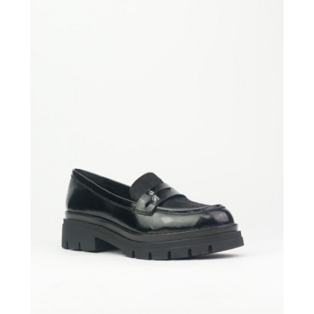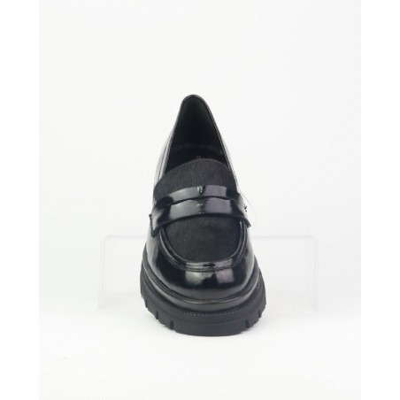 Mocasin piel marca Caramelo. Fabricado en charol negro combinado con potro negro. Forro piel. Altura de suela 4 cm y 2 cm de plataforma.
