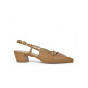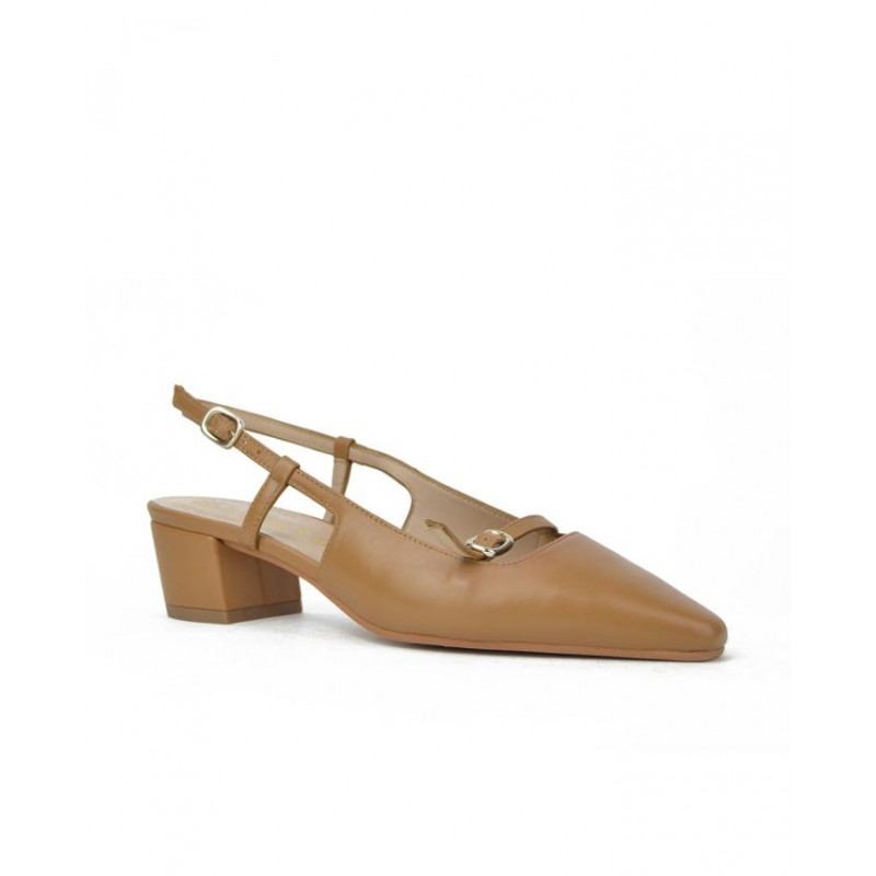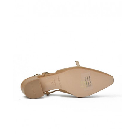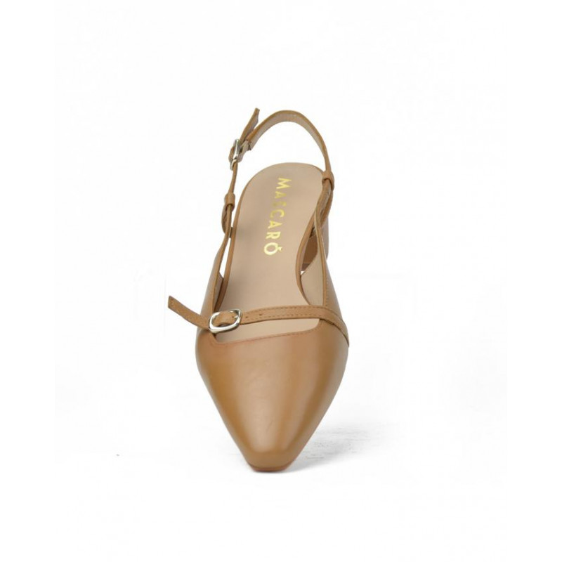 ZAPATO marca MASCARO modelo .SALON DESTALONADO TIRA Y HEBILLA. Fabricado en piel color camel, cierre con hebilla . Suela personalizada.