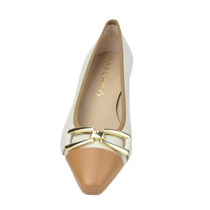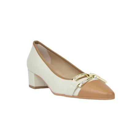 Zapato de tacón combinado blanco-cuero con detalle metálico en puntera.