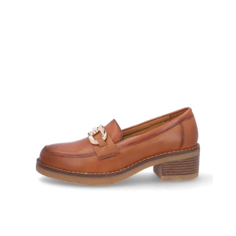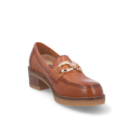 Zapatos de señora Nature fabricados en piel color camel, adorno metalico en parte delantera. Forro textil, plantilla textil, suela con tacon de 5 cm y plataforma de 2 cm altura. Composición: Empeine: Piel. Forro: Textil. Plantilla: Textil. Suela: Fibra sintetica. Componente principal: Piel